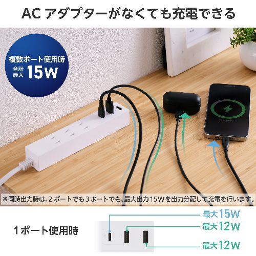 USB側定格出力(3ポート使用時):USB Type-Cポート+USB-Aポート+USB-Aポート:合計15W(5V/3A)(USB Type-C 15W(5V/3A)、各USB-A 12W(5V/2.4A))