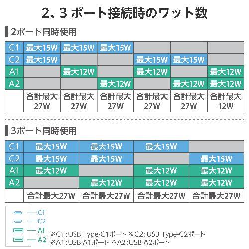 USB側定格出力(3ポート使用時):USB Type-Cポート+USB Type-Cポート+USB-Aポート:合計27W(5V/5.4A)(各USB Type-C 15W(5V/3A)、USB-A 12W(5V/2.4A))、USB Type-Cポート+USB-Aポート+USB-Aポート:合計27W(5V/5.4A)(USB Type-C 15W(5V/3A)、各USB-A 12W(5V/2.4A))