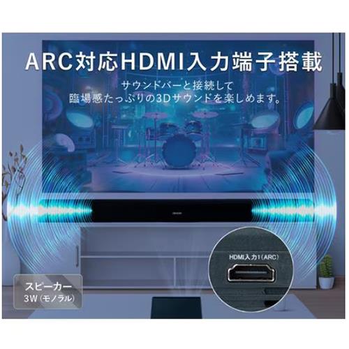 接続端子:USBポート×1、3.5mmフォンジャック×1、HDMI入力端子×3(ARC機能対応×1)(※HDMIケーブルは付属していません。)、AV入力端子×1