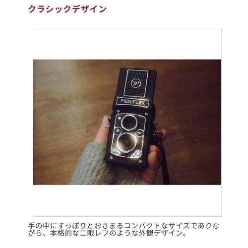 手の中にすっぽりとおさまるコンパクトなサイズでありながら、本格的な二眼レフのような外観デザイン。
