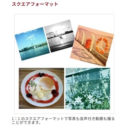 1:1 のスクエアフォーマットで写真も音声付き動画も撮ることができます。