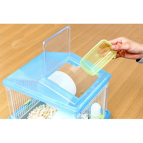 素材:屋根・トレー・ハウス・フタ・食器:ポリプロピレン、バックル:ABS樹脂、前・後面パネル、窓・まわし車:スチロール樹脂、フェンス:スチール(エポキシ粉体塗装)、給水ボトル:ポリエチレン