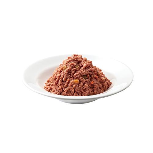 素材:肉類(鶏肉・牛肉)、野菜(にんじん、グリーンピース、コーン)、でん粉類、食塩、増粘安定剤(カラギナン)、ビタミン類(A・B1・B2・B3・B6・B12・D3・E・パントテン酸・コリン)、ミネラル類(Ca・K・Fe・Mn・Zn・l)、発色剤(亜硝酸Na)
