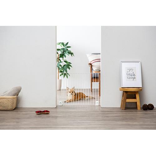 ■ペットに入って欲しくない場所の仕切りに最適なペットフェンスです。高級感のあるマットな質感でインテリアにぴったりなデザインです。自立型なので、置くだけで簡単に設置することができます。(フェンスはペットがいる部屋側に立て、脚パーツの長い方を内側にし、両端部を10cm以上壁に重ねて隙間ができないように設置してください。)付属のジョイントで連結することができます。(P-SPF-64 ジョイント×2)※4個セットの別売のジョイントもあります。(P-CS-30J)