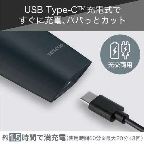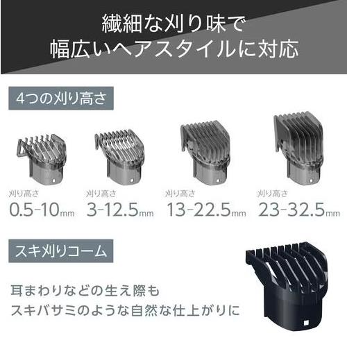 付属品:コーム4種(刈り高さ0.5mm-10mm/3mm-12.5mm/13mm-22.5mm/23mm-32.5mm)、スキ刈りコーム、電源ケーブル(USB Type-C(TM)- USB-A)、掃除用ブラシ、TESCOMオイル、収納ポーチ