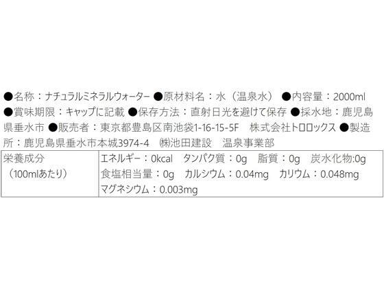 ●生産国:日本●採水地:鹿児島県垂水市●硬度:1.12●pH9.7●シリカ48mg/L、メタケイ酸(温泉成分)63mg/L含有