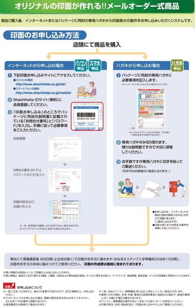 ●メールオーダー式(弊社からは本体のみをお届けいたします。印面は、本体お届け後メーカーに直接お申し込みください。)●印面を別途お申し込みいただく「メールオーダー式」印面お届けまでの流れ:(1)本体のみのお届け→(2)同封の専用ハガキまたはインターネットで印面のお申し込み。下記の書体、配列、インキ色から選べます。(■書体見本:楷書、行書、隷書、古印、明朝、角ゴシック、丸ゴシック、てん書■配列見本:1文字タイプ、2文字タイプ、3文字タイプ、4文字タイプ、5文字タイプ■インキ色:黒、赤、藍色、緑、朱色、紫)→(3)約8日後に印面のお届け。※印面作成費、送料は価格に含まれております。