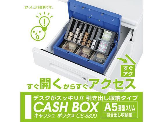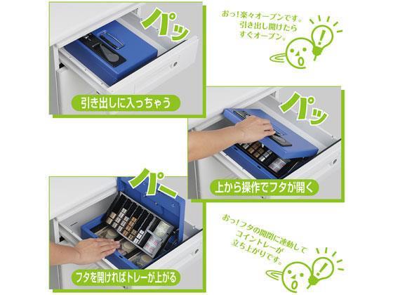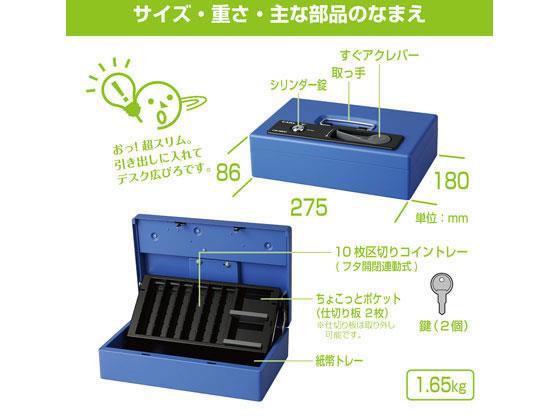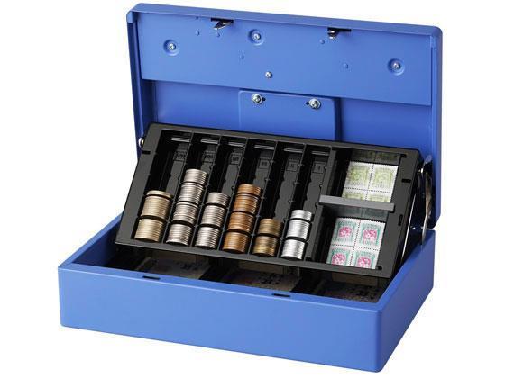 トレー下は3種類の紙幣が収納できる紙幣トレーになっています。●サイズ:(外寸)幅275×奥行180×高さ86mm、(内寸)幅78×奥行163×高さ21mm(紙幣スペース3箇所共通)●重量:1.65kg●材質:SPCC、ABS●施錠方式:シリンダー錠●10枚区切りコイントレー●硬貨収納枚数:500円50枚、100円50枚、50円50枚、10円50枚、5円50枚、1円50枚●付属品:鍵2個●色:ブルー●注文単位:1台