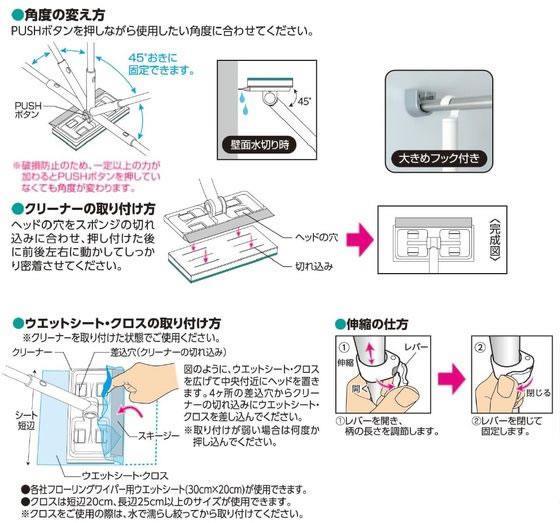 ウエットシートやクロスを取り付ければ、天井や壁など高い所のお掃除や水滴のふき取りに便利です。