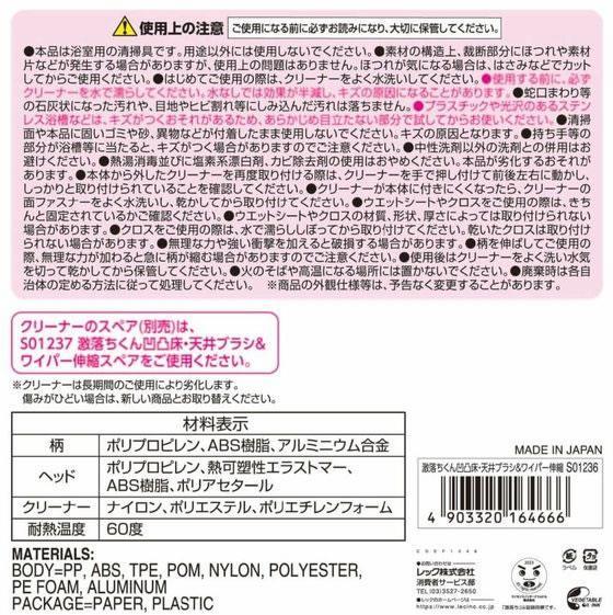 ●材質:柄/ポリプロピレン・ABS樹脂・アルミニウム合金、ヘッド/ポリプロピレン・熱可塑性エラストマー・ABS樹脂・ポリアセタール、クリーナー/ナイロン・ポリエステル・ポリエチレンフォーム