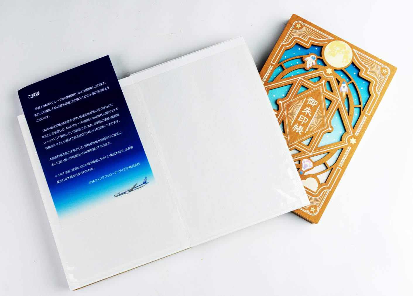 ANAグループと航空神社が贈る、旅の安全と願いを込めた特別なアイテム 数々の名だたる神社とのコラボレーションでご好評いただいている御朱印帳シリーズに、 待望の第7弾が登場。 今回は「航空神社」との特別なコラボレーションが実現しました! 航空安全を願う、由緒正しき航空神社 昭和6年に建立された航空神社は、航空会社の従業員はもちろん、航空業界を目指す方々、そして 「空の安全=落ちない」という験担ぎから受験合格を願う多くの方々が参拝される、由緒ある神社です。 宇宙飛行士や月、飛行機、気球をあしらった、他にはない珍しい意匠が特徴です。 空へのロマンと安全への願いが込められた特別なデザインを、ぜひお手元でお楽しみください。 皆さまの旅のお供となり、安全な旅路と素晴らしい思い出を重ねることを願っております。 仕様 サイズ : 縦180mm x 横120mm 仕様 : 御朱印20枚を収納可能なクリアポケット仕様 素材 : 表・裏表紙はMDF合板 デザイン補足 裏面中央は昭和6年建立時の航空会館 商品は、ANAウィングフェローズ・ヴイ王子株式会社から発送されます。