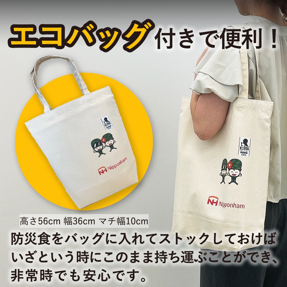 陸上自衛隊戦闘糧食モデルの防災食のアソートセットです。 賞味期限は製造日から5年6ヶ月。常温で長期保存が可能です。 あたため不要!袋からだしてそのまま食べられます。 ちょっとしたお買い物にも使えるエコバッグがついています。