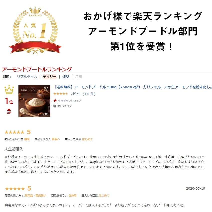 賞味期限 製造日より約180日 内容量 5kg(200g×25袋) ※2022年3月17日以降スプーンを付けておりません。 使用方法 お料理やお菓子の材料にお使い下さい 原材料 アーモンド※本品製造工場では、卵、乳、小麦、落花生、えび、かに、くるみ、アーモンド、カシューナッツ、ごま鯖、いか、マカデミアナッツ、大豆、バナナ、りんご、ゼラチンを含む製品を製造しています。 栄養成分 (100gあたり)エネルギー:587kcal、タンパク質:19.6g、脂質:51.8g、炭水化物:20.9g、食塩相当量:0.002g 保存方法 高温多湿、直射日光を避け涼しい所に保管してください。 製造国 アメリカ(カリフォルニア) 可能温度帯 常温 区分 食品 配送 宅配便にて発送 販売社 タマチャンショップ 宮崎県都城市平江町44-3 TEL0986-46-9669 メーカー名/広告文責 九南サービス 宮崎県都城市平江町44-3-2 TEL 0986-22-2852