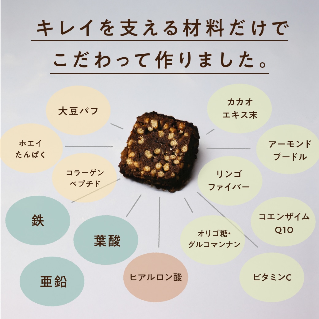 大豆加工食品(植物油脂、豆乳クリーム、豆乳、大豆粉、食塩)(国内製造)、大豆パフ(大豆たんぱく、でん粉、植物油脂)、小麦粉、アーモンドスライス、たんぱく含有食品(大豆たんぱく、乳清たんぱく(乳成分を含む)、海藻Ca、オリゴ糖、ビール酵母、りんごファイバー、グルコマンナン、コラーゲンペプチド(さけ・ゼラチンを含む)、赤ワインエ キス末、アサイー末、カカオエキス末、乳酸菌(還元澱粉糖化物、乳酸菌)、コエンザイムQ10)、砂糖、アーモンドプードル、たんぱく有食品(大豆たんぱく、乳清たんぱく、ココアパウダー、海藻Ca、オリゴ糖、食用酵母抽出物、りんごファイバー、グルコマンナン、コラーゲンペプチド、赤ワインエキス末、アサイー末、カカオエキス末、乳酸菌(還元澱粉糖化物、乳酸菌)、コエンザイムQ10)/トレハロース、炭酸Ca、V.C、クエン酸、酸化Mg、甘味料(羅漢果抽出物)、ヘム鉄、ナイアシン、ヒアルロン酸、グルコン酸亜鉛、V.E、パントテン酸Ca、V.B1、V.B6、V.B2、V.A、葉酸、V.D3、V.B12、レシチン、香料、(一部に小麦・乳成分・アーモンド・さけ・大豆・りんご・ゼラチンを含む)