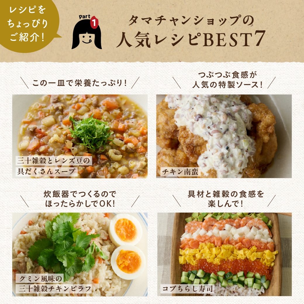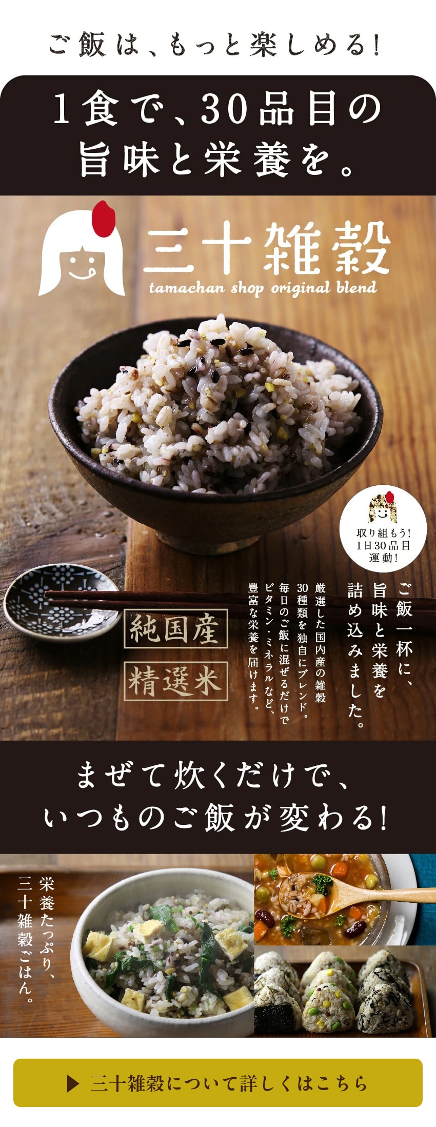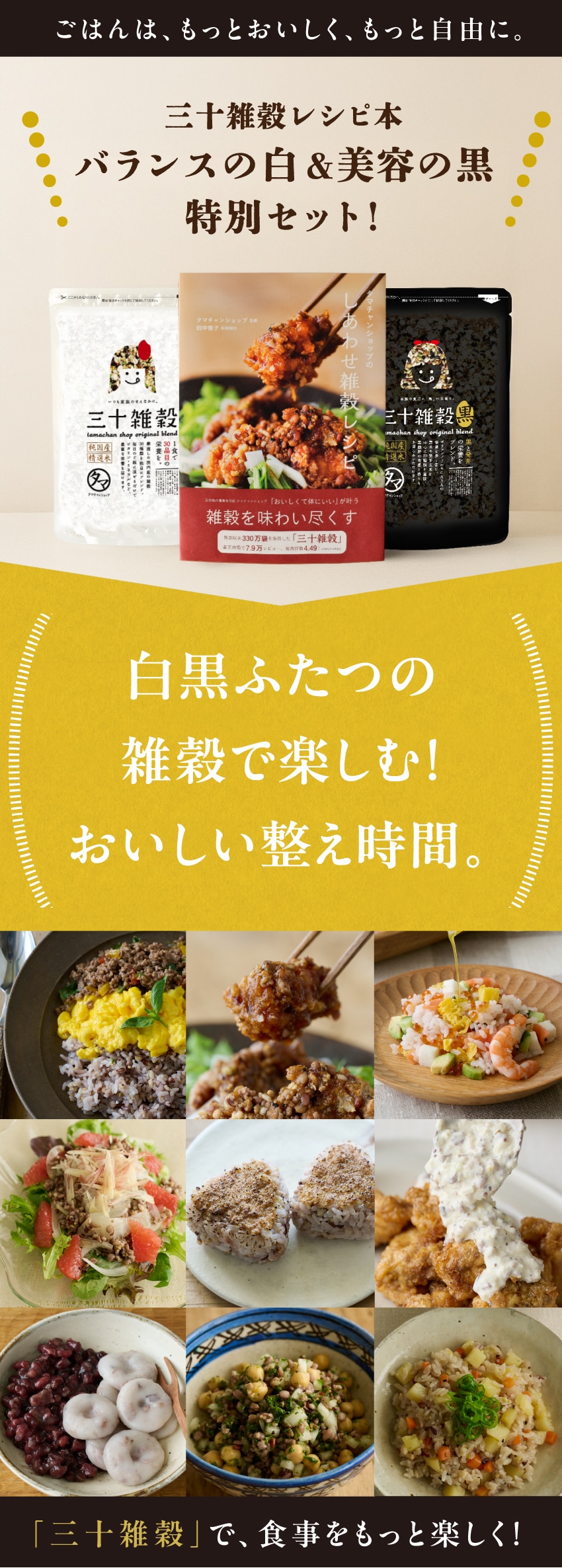 サイズ B5サイズ(182mm×257mm) ページ数 88ページ 詳細 宮崎県都城市発、自然食品専門店タマチャンショップの人気商品「三十雑穀」。 “家族の健康を、食からつくる”という想いのもと、30種類の国産雑穀を栄養バランスよくブレンドしました。 もち麦や黒米、アマランサスなど、ひと粒ひと粒に自然の恵みがぎゅっと詰まっています。 手軽においしく、毎日のごはんで30品目の栄養をサポート。 本書では、そんな「三十雑穀」をもっと楽しむための、とっておきレシピをたっぷりご紹介します。 雑穀米原材料・栄養成分 三十雑穀(白)はこちら三十雑穀(黒)はこちら 雑穀米保存方法 高温多湿、直射日光を避け涼しい所に保管してください 夏場の保存 夏の高温シーズンでの保存や長期保管の場合は出入る限り自然食材の為、冷蔵庫や冷凍庫での保存をおすすめしております。 雑穀米可能温度帯 常温 製造国 日本(九州) 区分 書籍・食品 出版社 一般社団法人 家の光協会・JAグループ 配送 2セットまでメール便/3セット以上宅配便 販売社 タマチャンショップ 宮崎県都城市平江町44-3 TEL0986-46-9669 メーカー名/広告文責 九南サービス 宮崎県都城市平江町44-3-2 TEL 0986-22-2852