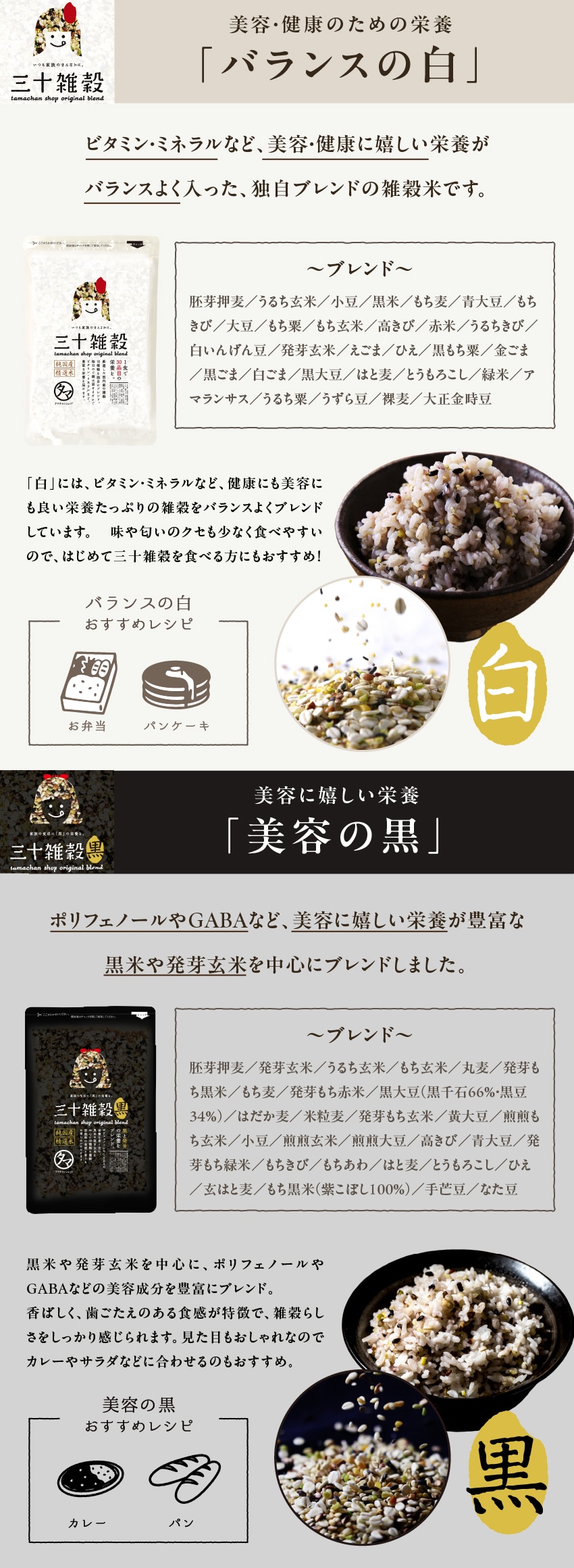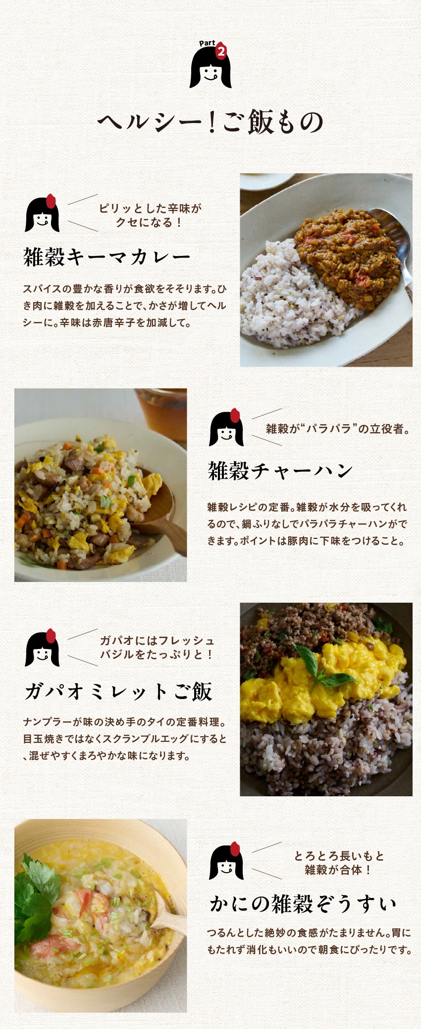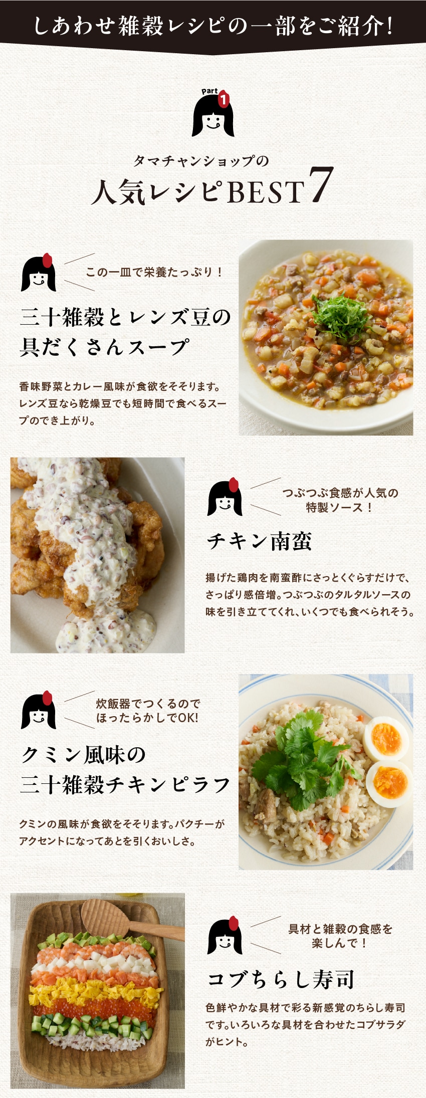 サイズ B5サイズ(182mm×257mm) ページ数 88ページ 詳細 宮崎県都城市発、自然食品専門店タマチャンショップの人気商品「三十雑穀」。 “家族の健康を、食からつくる”という想いのもと、30種類の国産雑穀を栄養バランスよくブレンドしました。 もち麦や黒米、アマランサスなど、ひと粒ひと粒に自然の恵みがぎゅっと詰まっています。 手軽においしく、毎日のごはんで30品目の栄養をサポート。 本書では、そんな「三十雑穀」をもっと楽しむための、とっておきレシピをたっぷりご紹介します。 雑穀米原材料・栄養成分 三十雑穀(白)はこちら三十雑穀(黒)はこちら 雑穀米保存方法 高温多湿、直射日光を避け涼しい所に保管してください 夏場の保存 夏の高温シーズンでの保存や長期保管の場合は出入る限り自然食材の為、冷蔵庫や冷凍庫での保存をおすすめしております。 雑穀米可能温度帯 常温 製造国 日本(九州) 区分 書籍・食品 出版社 一般社団法人 家の光協会・JAグループ 配送 2セットまでメール便/3セット以上宅配便 販売社 タマチャンショップ 宮崎県都城市平江町44-3 TEL0986-46-9669 メーカー名/広告文責 九南サービス 宮崎県都城市平江町44-3-2 TEL 0986-22-2852