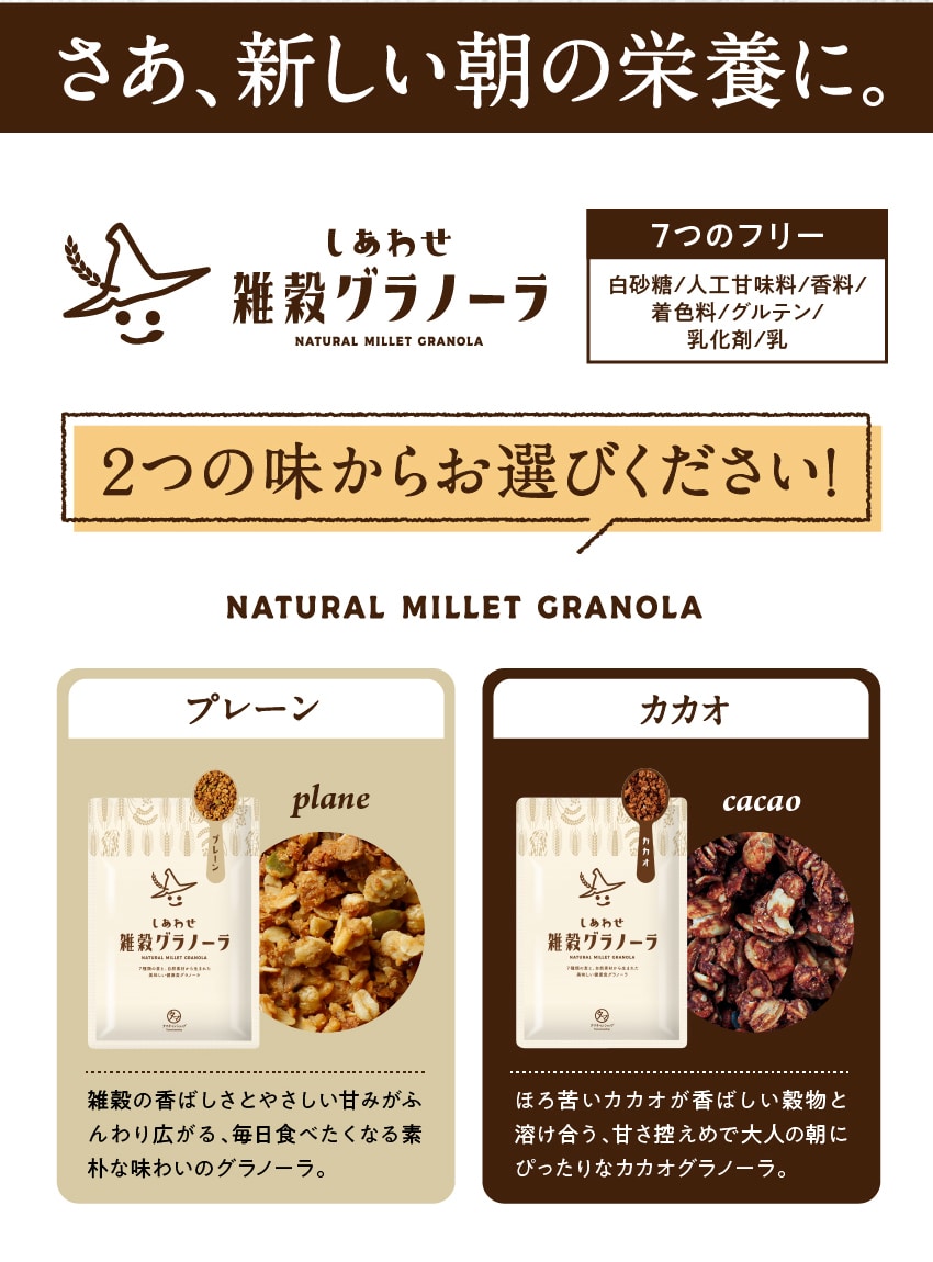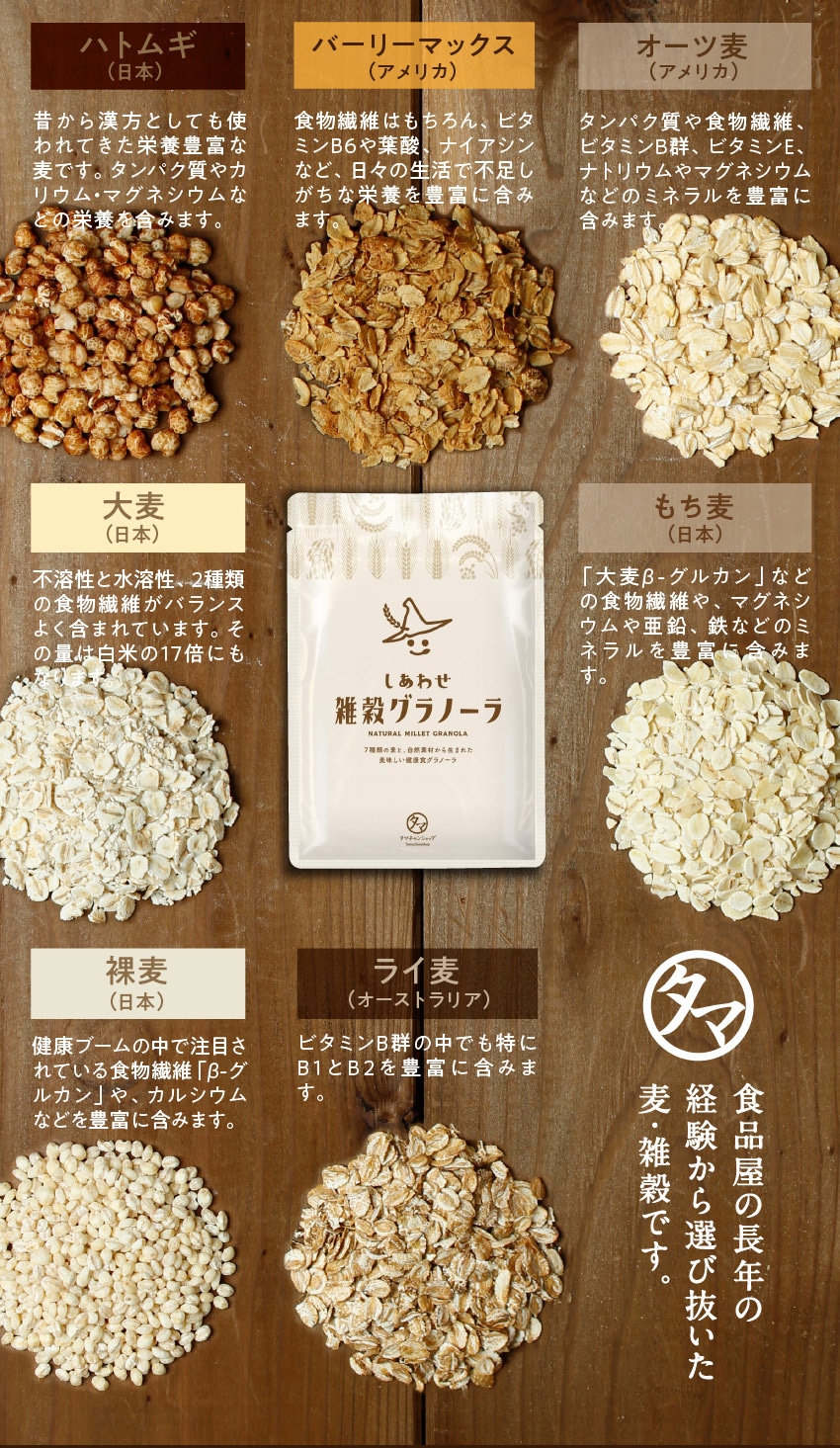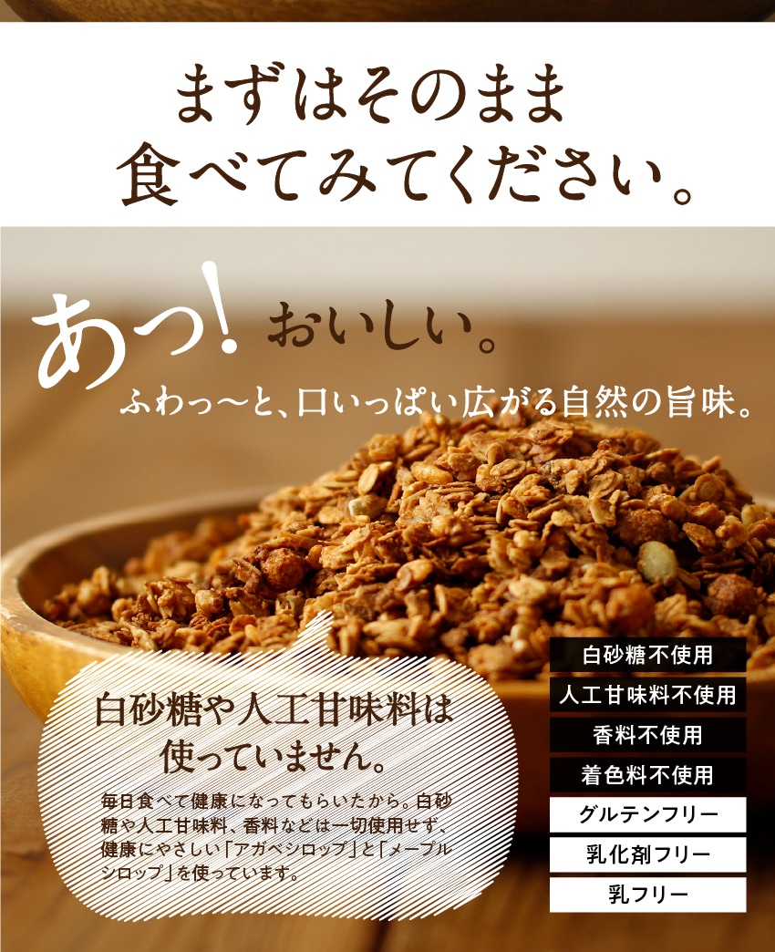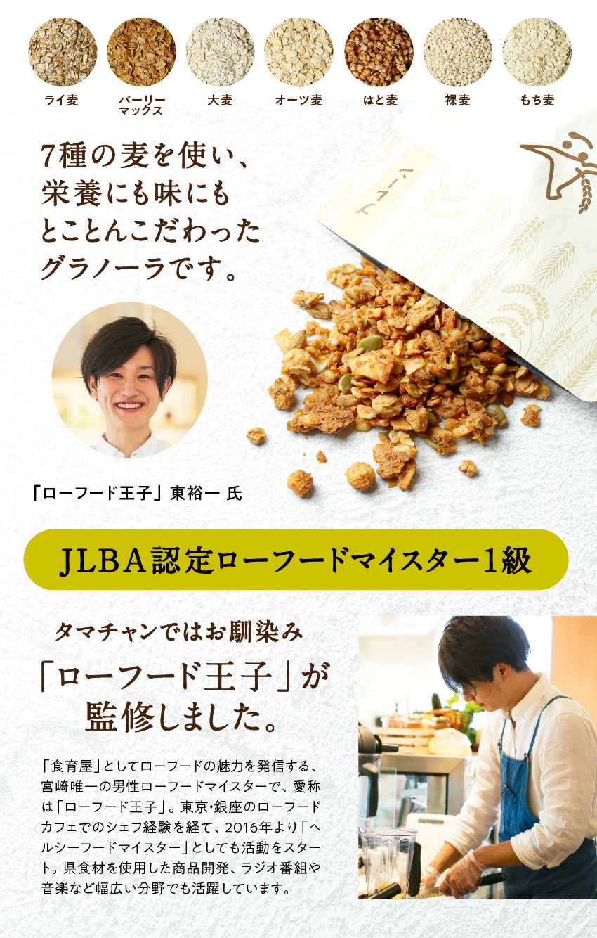 賞味期限 製造日より約6カ月 内容量 180g ジッパー式袋タイプ 使用方法 ミルクや豆乳をかけてお召し上がりください。料理などのレシピとしてもお役立て頂けます。 原材料 【カカオ】 オーツ麦(オーストラリア産)、アガベシロップ、ライ麦フレーク、ココナッツオイル、有機ココナッツスライス、大麦フレーク、カカオニブ、オーツ麦粉、はだか麦粉、もち麦粉、メープルシロップ、植物性たんぱく、カカオパウダー、はと麦、玄米フレーク、大豆パフ、キヌアパフ、食塩/保存料(亜硫酸塩)、(一部に大豆を含む) 栄養成分 (カカオ/100gあたり) エネルギー:490kcal、タンパク質:10.6g、脂質:23.4g、炭水化物:63.1g[糖質:55.2g、食物繊維:7.9g]、食塩相当量:0.28g 保存方法 高温多湿、直射日光を避け涼しい所に保管してください。 ※開封後はお早めにお召し上がり下さい。 製造国 日本(九州) 可能温度帯 常温 区分 食品 配送 2個までメール便/3個から宅配便 販売社 タマチャンショップ 宮崎県都城市平江町44-3 TEL0986-46-9669 メーカー名/広告文責 九南サービス 宮崎県都城市平江町44-3-2 TEL 0986-22-2852