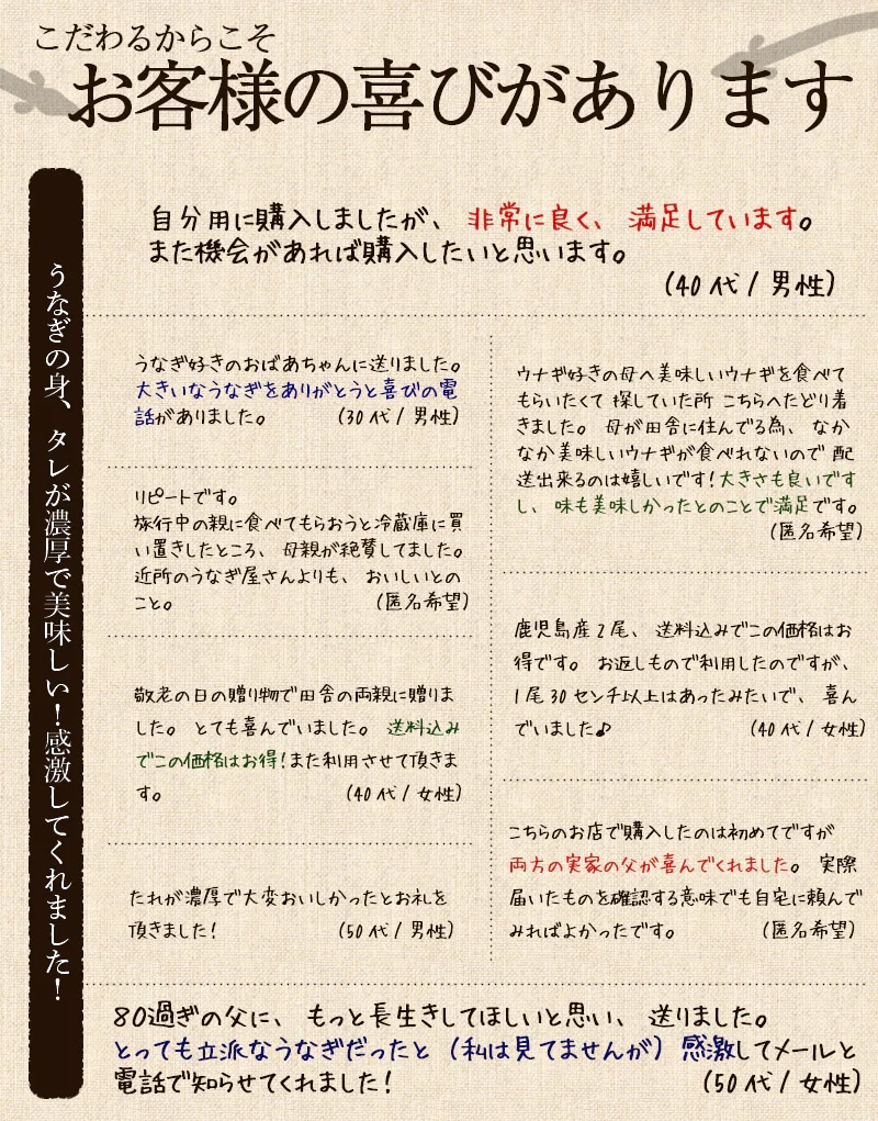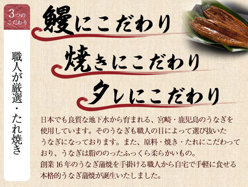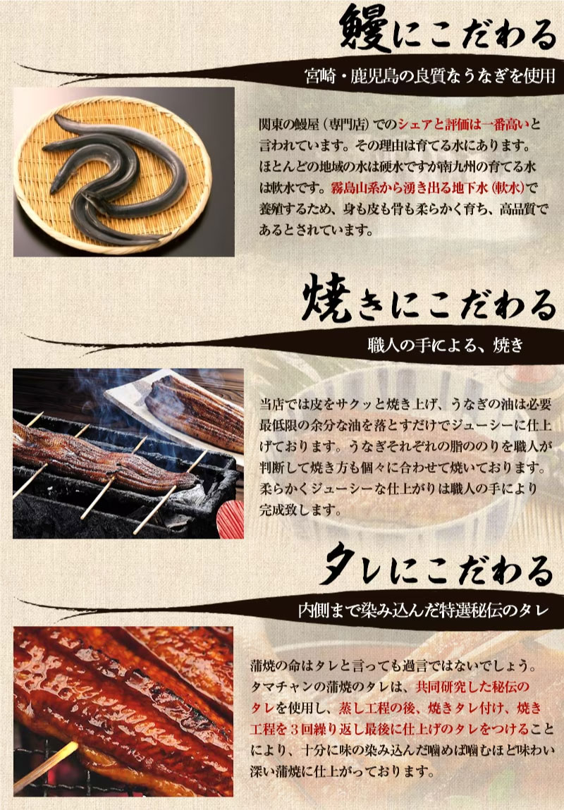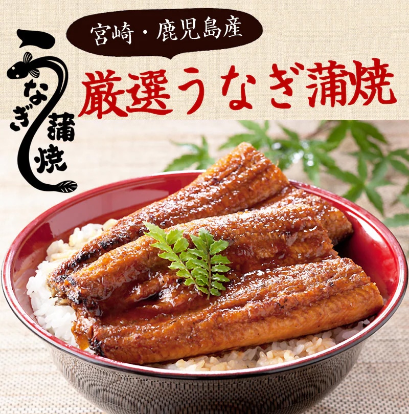 【賞味期限】 製造日より約2年 【内容量】 1尾あたり約130g~150g前後(2尾セット)、蒲焼きタレ90g 【使用方法】 調理してお召し上がりください。 【原材料】 ウナギ(宮崎・鹿児島)、しょうゆ(大豆小麦を含む)、砂糖、発酵調味料、水飴・うなぎエキス、酒精、増粘剤(加工澱粉)、調味料(アミノ酸等)・着色料(カラメル・アナトー)(原材料の一部に小麦・大豆を含む) 【保存方法】 冷凍庫で保存(解凍後はお早目にお召し上がり下さい) 【可能温度帯】 冷凍 【製造国】 日本(九州) 【区分】 食品 【販売者】 タマチャンショップ 宮崎県都城市平江町44-3 TEL0986-46-9669 【メーカー名/広告文責】 九南サービス 宮崎県都城市平江町44-3-2 TEL 0986-22-2852
