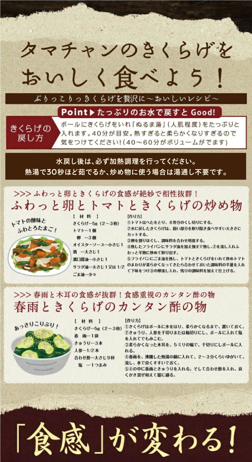 ※黒きくらげの表面に見られる白いものは胞子ですので、品質に問題はございません。水洗いしてお使いください。