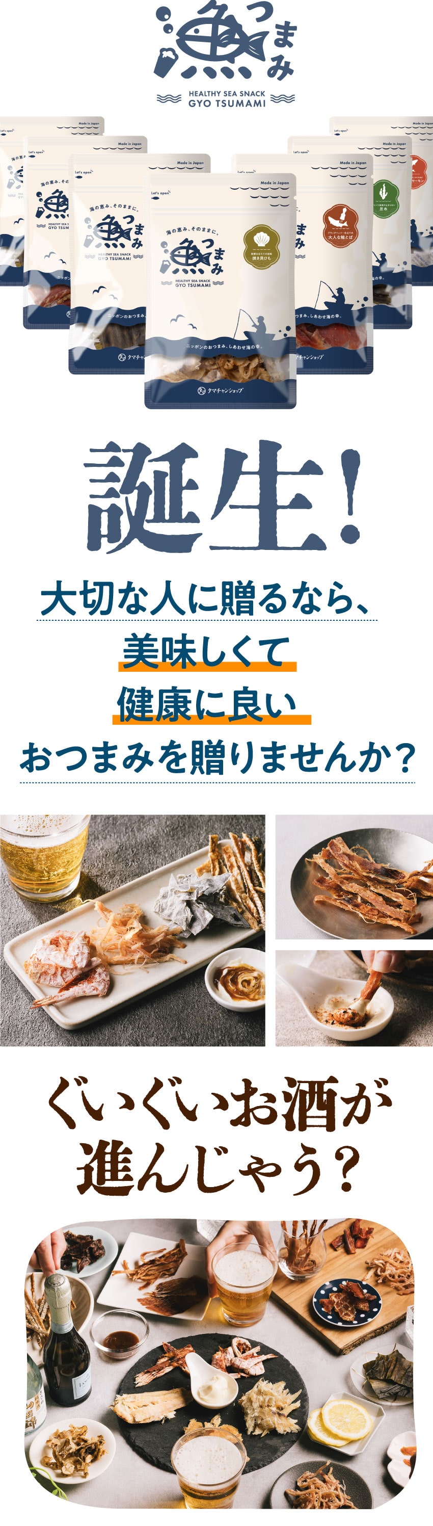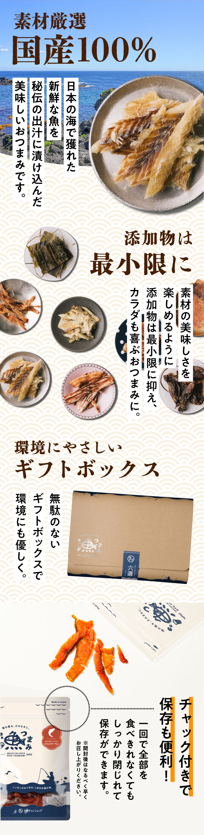 【賞味期限】 製造日より約5ヶ月※パリパリ昆布のみ製造日より約7ヶ月 【内容量】 むしりたら 30g ソフトあたりめ 22g ほたて貝焼きひも 30g 大人な鮭とば 33g 柔らかサーモン 30g パリパリ昆布 20g 【お召し上がり方】 おつまみ・お酒の肴としてお召し上がりください。 【原材料】 【 むしりたら 】 助宗鱈(北海道産) 、砂糖(甜菜糖)、還元水飴、醸造酢、昆布だし、かつおだし、食塩(海塩)、みりん、しいたけだし 【 ソフトあたりめ 】 いか(北海道産) 、砂糖(甜菜糖)、食塩(海塩)、さんま魚醤、昆布だし、かつおだし、しいたけだし 【 焼きホタテ貝ひも 】 ほたて貝ひも(北海道製造)、砂糖(甜菜糖)、食塩(海塩)、昆布だし、かつおだし 、しいたけだし、さんま魚醤 【 大人な鮭とば 】 鮭(北海道産)、還元水飴、昆布だし、かつおだし、しいたけだし、酵母エキス、食塩(海塩)、昆布醤油、黒胡椒 (原料の一部に小麦・さけ・大豆を含む) 【 柔らかサーモン 】 鮭(北海道産) 、砂糖(甜菜糖) 、食塩(海塩)、昆布だし、かつおだし、しいたけだし、さんま魚醤、米黒酢 (一部にさけを含む) 【 パリパリ昆布 】 昆布(北海道産)、砂糖(甜菜糖)、昆布醤油、醸造酢、昆布だし、かつおだし、しいたけだし、酵母エキス、食塩(海塩)、(一部に小麦・大豆を含む) ●※本品製造工場では卵、乳、落花生、えび、クルミ、小麦を含む製品を製造しています。 ●※自然の素材と手作りの製品になりますので、小骨等には注意してお召し上がりください。 【栄養成分】 (1袋あたり / 推定値) 【 むしりたら 】 熱量:87kcal たんぱく質:13.0g 脂質:0.18g 炭水化物:8.3g 食塩相当量:1.1g 【 ソフトあたりめ 】 熱量:62.3kcal たんぱく質:10.2g 脂質:0.6g 炭水化物:3.96g 食塩相当量:1.1g 【 焼きホタテ貝ひも 】 熱量:95.4kcal たんぱく質:12.0g 脂質:0.27g 炭水化物:11.3g 食塩相当量:1.3g 【 大人な鮭とば 】 熱量:91.4kcal たんぱく質:14.2g 脂質:1.12g 炭水化物:6.1g 食塩相当量:1.6g 【 柔らかサーモン 】 熱量:87.3kcal たんぱく質:15.5g 脂質:1.3g 炭水化物:3.4g 食塩相当量:1.6g 【 パリパリ昆布 】 (20g当たり)熱量:69.8kcal たんぱく質:1.7g 脂質:0.9g 炭水化物:13.8g 食塩相当量:1.5g 【保存方法】 高温多湿、直射日光を避け涼しい所に保管してください。 開封後は冷蔵庫(10℃以下)で保管し、お早めにお召し上がりください。 【可能温度帯】 常温・冷蔵 【製造国】 日本 【区分】 食品 【販売者】 タマチャンショップ 宮崎県都城市平江町44-3 TEL0986-46-9669 【メーカー名/広告文責】 九南サービス 宮崎県都城市平江町44-3-2 TEL 0986-22-2852