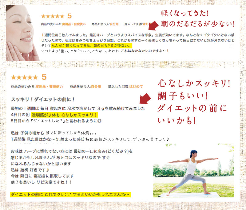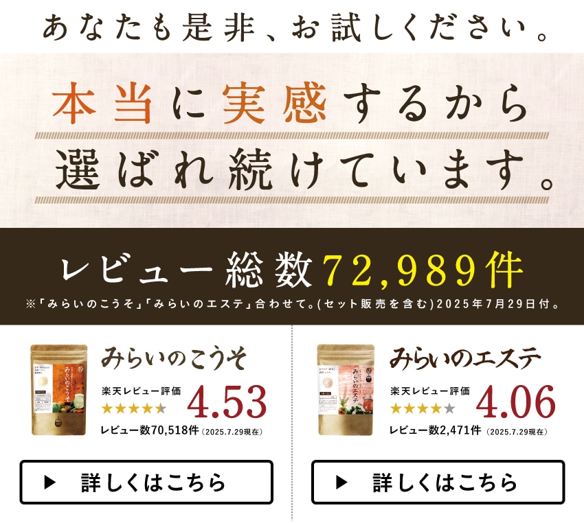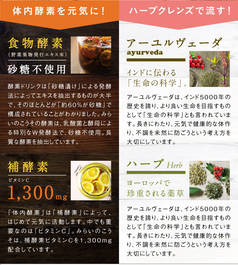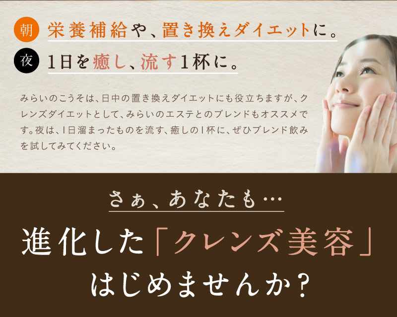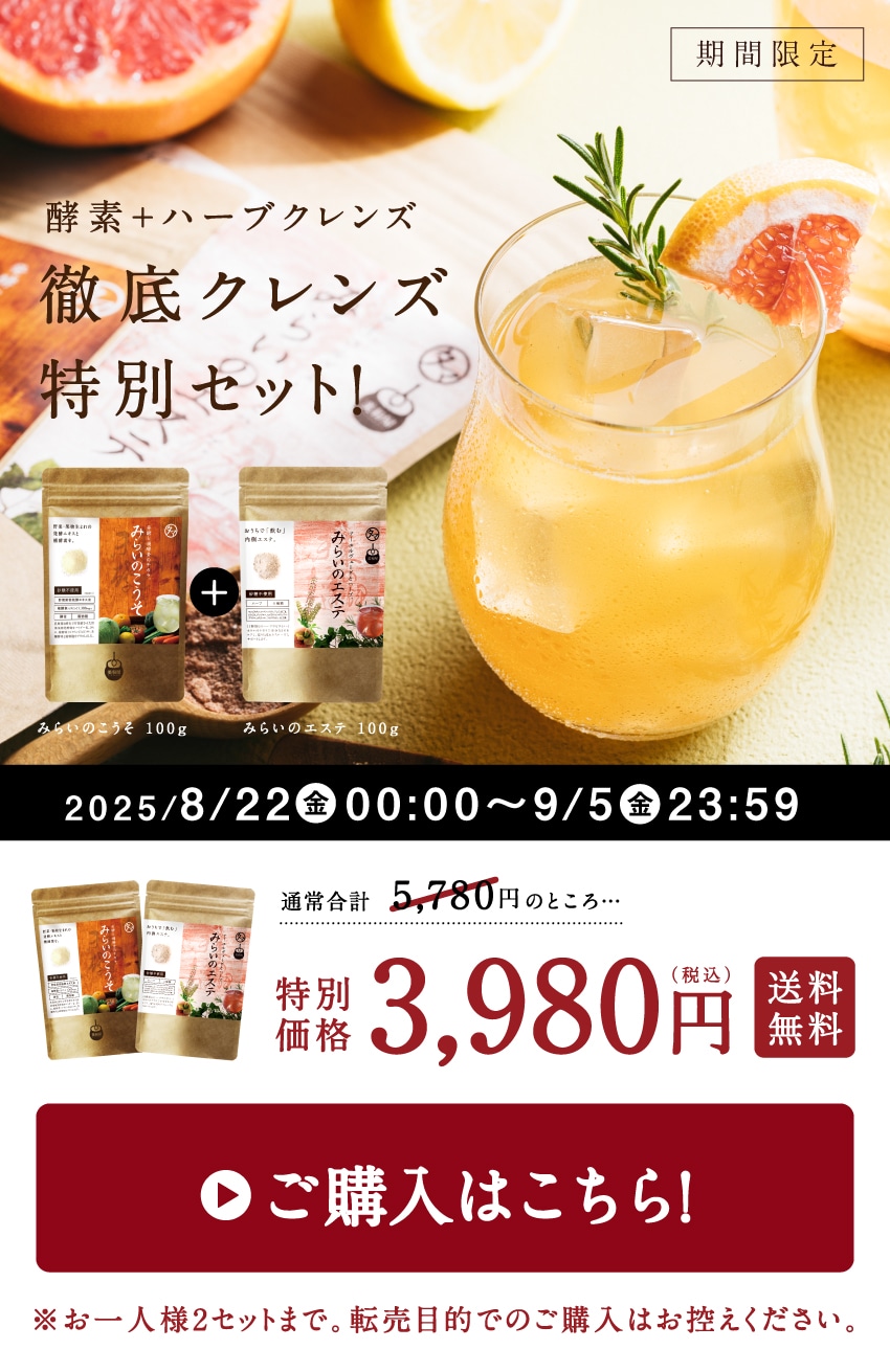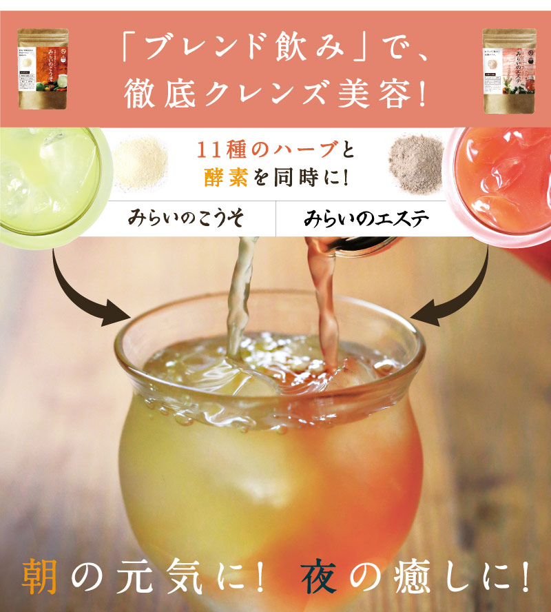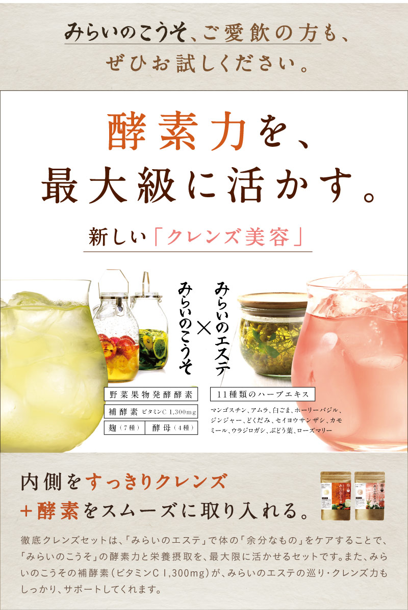 賞味期限 約20ヶ月 内容量 みらいのこうそ 100g みらいのエステ 100g(約33杯分) 使用方法 1杯約3g程度を約100ccの水や炭酸水などに溶かしてお飲み下さい。1日又は2日に一杯を目安にご使用下さいませ。 原材料 【みらいのエステ】 直鎖オリゴ糖、フラクトオリゴ糖、難消化性デキストリン、生姜(黄金生姜)、システインペプチド含有酵母エキス、MSM、亜 鉛含有酵母、 ウラジロガシ抽出エキス末、紅景天末、イチゴ 抽出物、タマネギ薄皮エキス末、ツルアラメエキス末、混合 ハーブ抽出物(ドクダミ、セイヨウサンザシ、ローマカミツレ、ブドウ葉)、 アムラ抽出エキス末、マンゴスチン抽出エキス末、白ゴマエキス末、ホーリーバジルエキス末、ローズマリー末、食塩(岩塩)、セレン含有酵母、ビタミンC、香料(レモン、ショウガ)、紅麹色素、 クエン酸、乳酸カルシウム、カロテン色素、甘味料(ステビア、スクラロース)、ヘム鉄(豚由来)、L-メチオニン、グリシン、L-グルタミン、L-シスチン、ビタミンE、ナイアシン、ラクトフェリン(乳由来)、 パントテン酸Ca、ビタミンB1、ビタミンB6、ビタミンB2、ビタミンA、葉酸、ビタミンD、ビタミンB12 天然素材使用のため多少色むらが生じることがありますが、品質には問題ございません 【みらいのこうそ】 デキストリン(鹿児島県、宮崎県産)、さつまいも澱粉(鹿児島県、宮崎県産)、野菜果物発酵エキス末(ダイコン、人参、カブ、キュウリ、トマト、ピーマン、オクラ、カイワレ、にら、キャベツ、白菜、レタス、菊菜、もやし、チンゲン菜、水菜、間引き菜、ターサイ、パセリ、セロリ、ふき、アスパラガス、ブロッコリー、カリフラワー、ねぎ、セリ、唐辛子、芽キャベツ、ナス、生姜、大豆もやし、モロヘイヤ、空芯菜、三つ葉、サニーレタス、サンチュ、サラダ菜、小松菜、とうみょう、しし唐、パプリカ、プリンスメロン、パイナップル、スイカ、キウイフルーツ、みかん、オレンジ、イチジク、はっさく、ポンカン、ゆず、金柑、イチゴ、リンゴ、ぶどう、梨、柿、スダチ、カボス、シメジ、エノキ茸、椎茸、舞茸、ヒジキ、コンブ、デキストリン)、ローズヒップ末、桑の葉エキス末、アセロラ果汁末、システインペプチド含有酵母末、もろみ粉末、亜鉛含有酵母末、ビール酵母末、穀物こうじ末(大麦、あわ、ひえ、タカキビ、紫黒米、米粉)、セレン含有酵母末、フルーツエキス末(オレンジ、グレープフルーツ、レッドオレンジ、ガラナエキス、マルトデキストリン)、フルーツ・野菜エキス末(ぶどう、トマト、人参、ビルベリー、茶葉、グレープフルーツ、パパイヤ、パイナップル、イチゴ、りんご、アプリコット、さくらんぼ、オレンジ、ブラックカラント、ブロッコリー、キャベツ、玉ねぎ、にんにく、オリーブ、キュウリ、アスパラガス)/ビタミンC、甘味料(羅漢果抽出物、ステビア)、香料、ニコチン酸アミド、パントテン酸カルシウム、ビタミンE、ビタミンB6、ビタミンB2、ビタミンB1、ビタミンA、葉酸、ビタミンD、ビタミンB12 ※原材料に遺伝子組み換え原料は使用しておりません。 栄養成分 【みらいのエステ】 ●1食(3gあたり) ●1日女性平均摂取カロリー目安 ●全国平均1800~2200kcalに対し ●熱量:11.2kcal ●たんぱく質:0.17g ●脂質:0.02g ●炭水化物(食物繊維含む):2.58g ●ナトリウム:5.55mg 【みらいのこうそ】1食(3gあたり) 1日女性平均摂取カロリー目安 全国平均1800~2200kcalに対し 熱量5.94~6.75kcal、たんぱく質0.02g、脂質0.04g、炭水化物1.38g、食塩相当量0.001g トランス脂肪酸ゼロ/飽和脂肪酸ゼロ/コレステロールゼロ 保存方法 高温多湿、直射日光を避け涼しい所に保管してください 製造国 日本 可能温度帯 常温 区分 健康食品 配送 1セットまでメール便/2セットから宅配便にて発送 販売社 タマチャンショップ 宮崎県都城市平江町44-3 TEL0986-46-9669 メーカー名/広告文責 九南サービス 宮崎県都城市平江町44-3-2 TEL 0986-22-2852