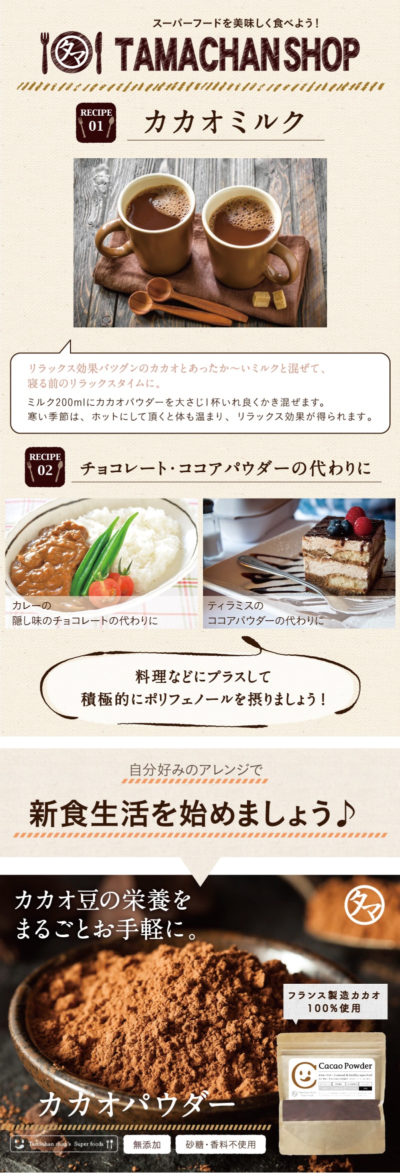 賞味期限 未開封の場合~約1年(開封後はお早めにご使用ください) 内容量 200g×5袋 使用方法 ホットココア、スイーツ等に混ぜてお召し上がりください。 原材料 カカオ豆 栄養成分 【100gあたり】 エネルギー405kcal タンパク質23g 脂質23g 炭水化物 41g 食塩相当0.076g カカオポリフェノール 3010mg 保存方法 高温多湿、直射日光を避け涼しい所に保管してください。開封後は温度差のあまりない場所での保管をお勧めします。 製造国 フランス 可能温度帯 常温 区分 食品 配送 1セットまでメール便/2セットから宅配便 販売社 タマチャンショップ 宮崎県都城市平江町44-3 TEL0986-46-9669 メーカー名/広告文責 九南サービス 宮崎県都城市平江町44-3-2 TEL 0986-22-2852