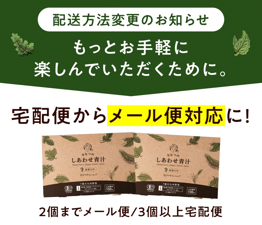 賞味期限 約2年 内容量 3g×30包 使用方法 1日1杯1包(3g)程度を目安に溶かしてお飲み下さい。 原材料 有機桑葉末(桑葉(九州産))、有機大麦若葉末(大麦若葉(九州産))、さつまいも澱粉、有機カワラケツメイ末、有機長命草末、胡麻若葉末、有機抹茶末、モリンガパウダー ※妊娠中の方または可能性のある方はご使用をお控えください 栄養成分 (3g/1包あたり)●熱量8.82kcal ●たんぱく質0.76g ●脂質0.14g ●炭水化物1.66g(糖質:0.58g / 食物繊維:1.08g) ●食塩相当量0.004g 保存方法 高温多湿、直射日光を避け涼しい所に保管してください 製造国 日本 可能温度帯 常温 区分 青汁 配送 2個までメール便/3個以上宅配便 販売社 タマチャンショップ 宮崎県都城市平江町44-3 TEL0986-46-9669 メーカー名/広告文責 九南サービス 宮崎県都城市平江町44-3-2 TEL 0986-22-2852