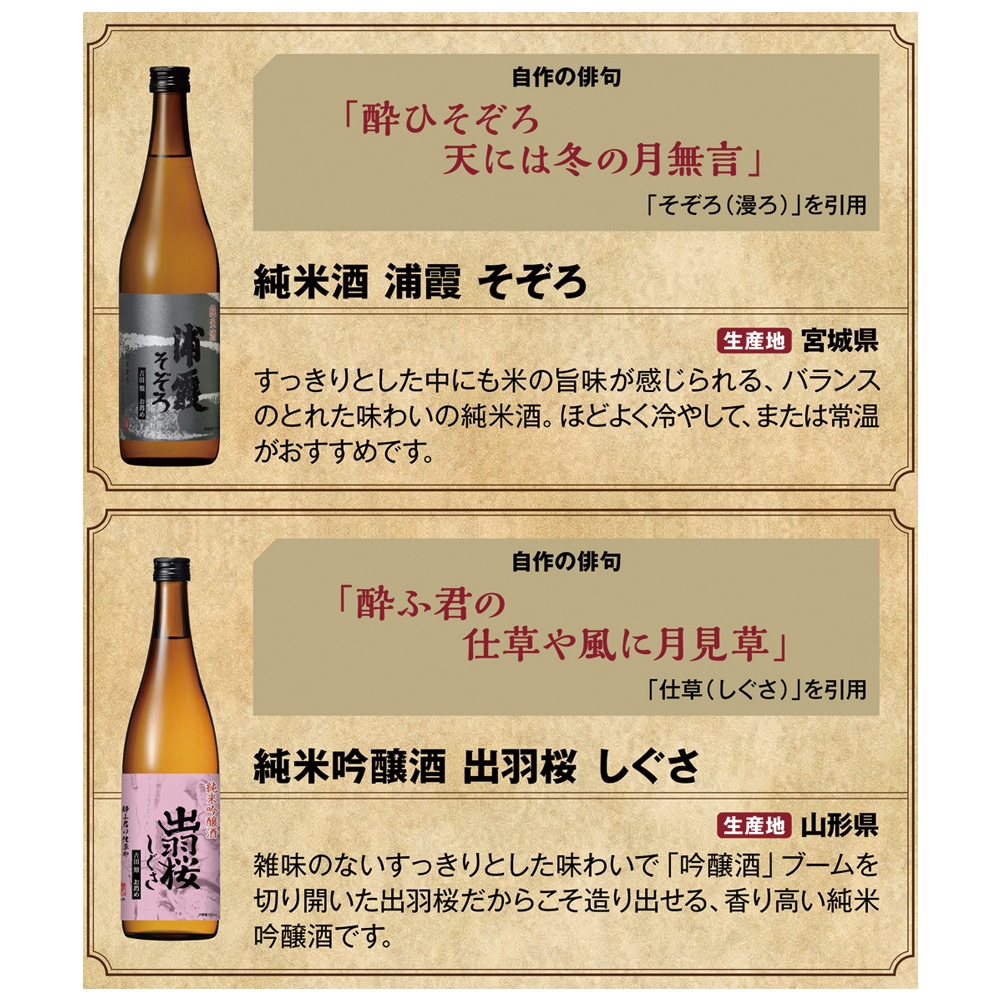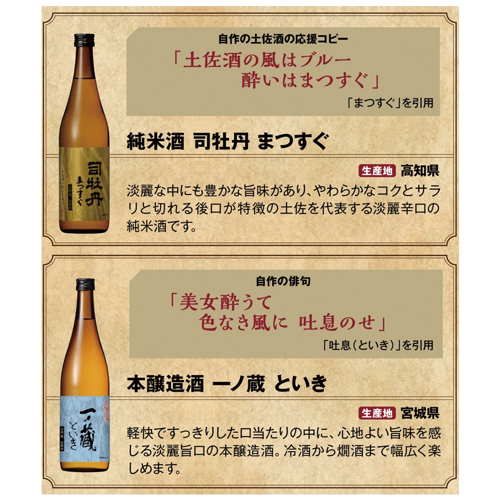 「酒場詩人」としておなじみの、吉田類さんがお薦めする日本酒セットです。 \味香り戦略研究所×吉田類/ 酒場詩人の吉田類さんと「味香り戦略研究所」の「味覚センサー」分析から生まれた食事か楽しくなる地酒登場! 「お酒」という言葉から連想される著名人のひとり、「酒場詩人」として人気の吉田類さんがアドバイスされた日本酒セットです。 ●吉田類お薦め地酒 浦霞そぞろ 純米酒 720ml 【生産地:宮城県】 すっきりとした中にも米の旨味が感じられる、バランスのとれた味わいの純米酒。 ほどよく冷やして、または常温がおすすめです。 ●吉田類お薦め地酒 司牡丹まつすぐ 純米酒 720ml 【生産地:高知県】 淡麗な中にも豊かな旨味があり、やわらかなコクとサラリと切れる後口が特徴の 土佐を代表する淡麗辛口の純米酒です。 ●吉田類お薦め地酒 一ノ蔵といき 本醸造酒 720ml 【生産地:宮城県】 軽快ですっきりとした口当たりの中に、心地よい旨味を感じる淡麗旨口の本醸造酒。 冷酒から燗酒まで幅広く楽しめます。 ●吉田類お薦め地酒 出羽桜しぐさ 純米吟醸酒 720ml 【生産地:山形県】 雑味のないすっきりとした味わいで「吟醸酒」ブームを切り開いた出羽桜だからこそ造り出せる、 香り高い純米吟醸酒です。