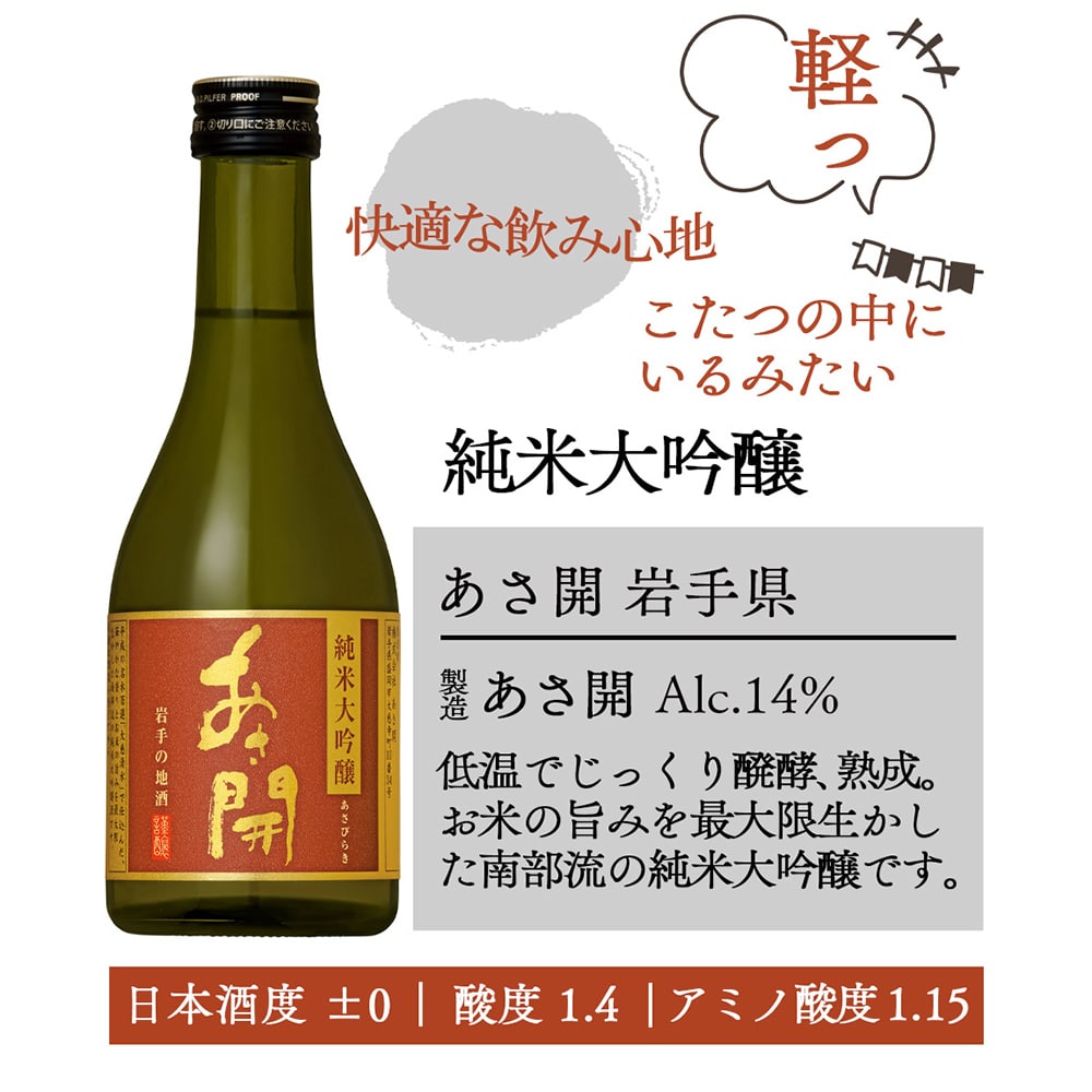 内容量:300ml×6本1.あさ開純米大吟醸【生産地:岩手県】