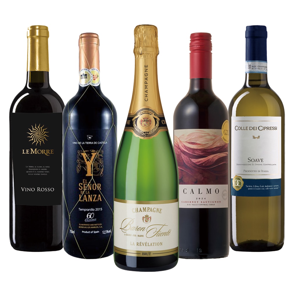金賞受賞シャンパン入り! 36ヵ月以上熟成させたエレガントで果実味豊かなフランス産シャンパンと、辛口の赤白ワインを組み合わせました。 フランス、チリ、スペイン、イタリア産厳選ワインをお楽しみいただけるセットです。