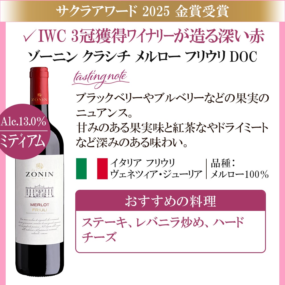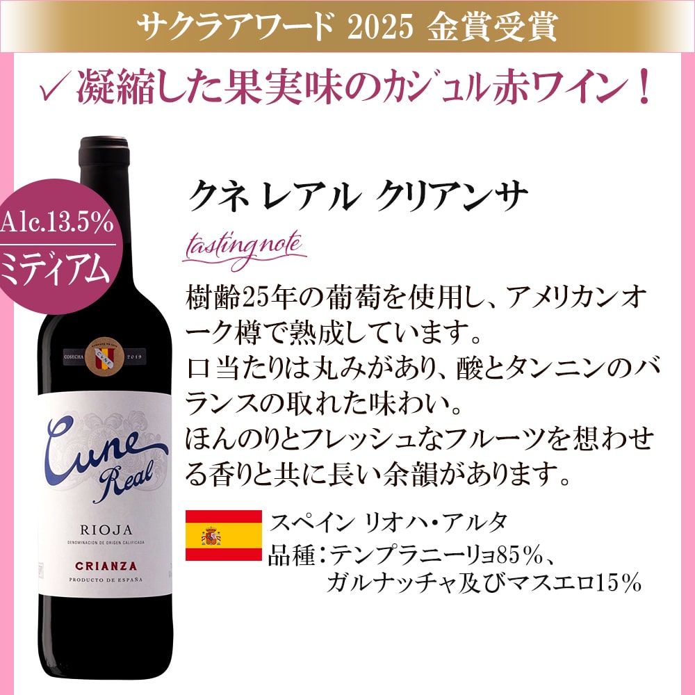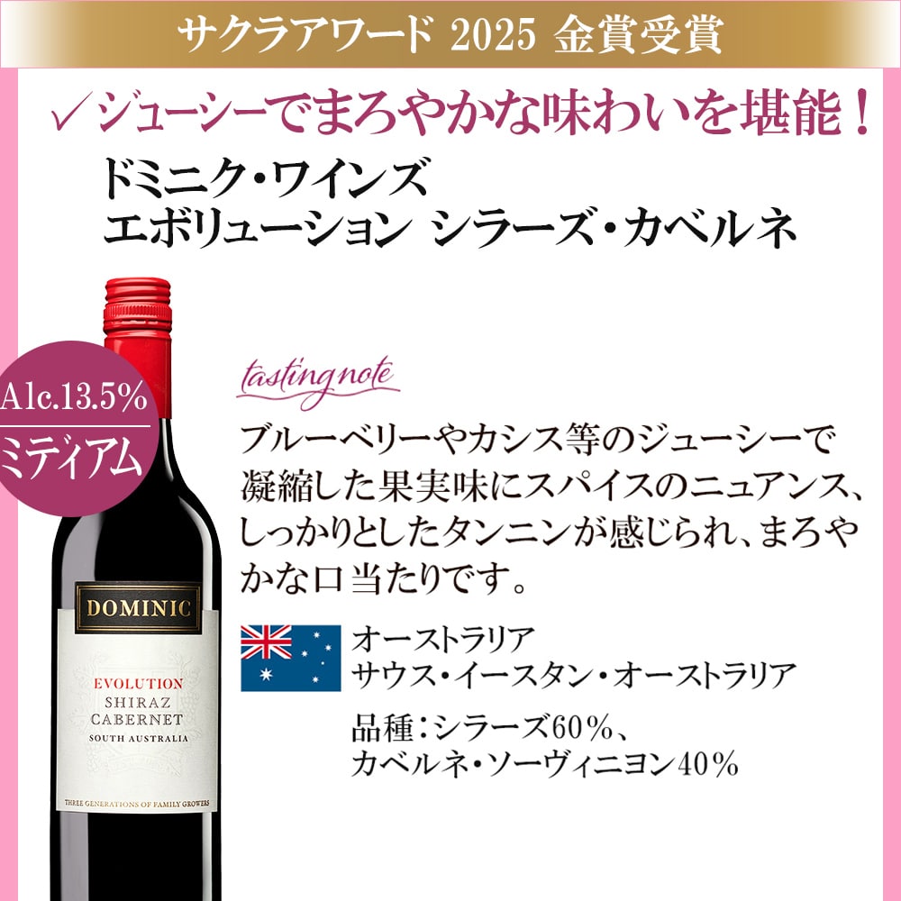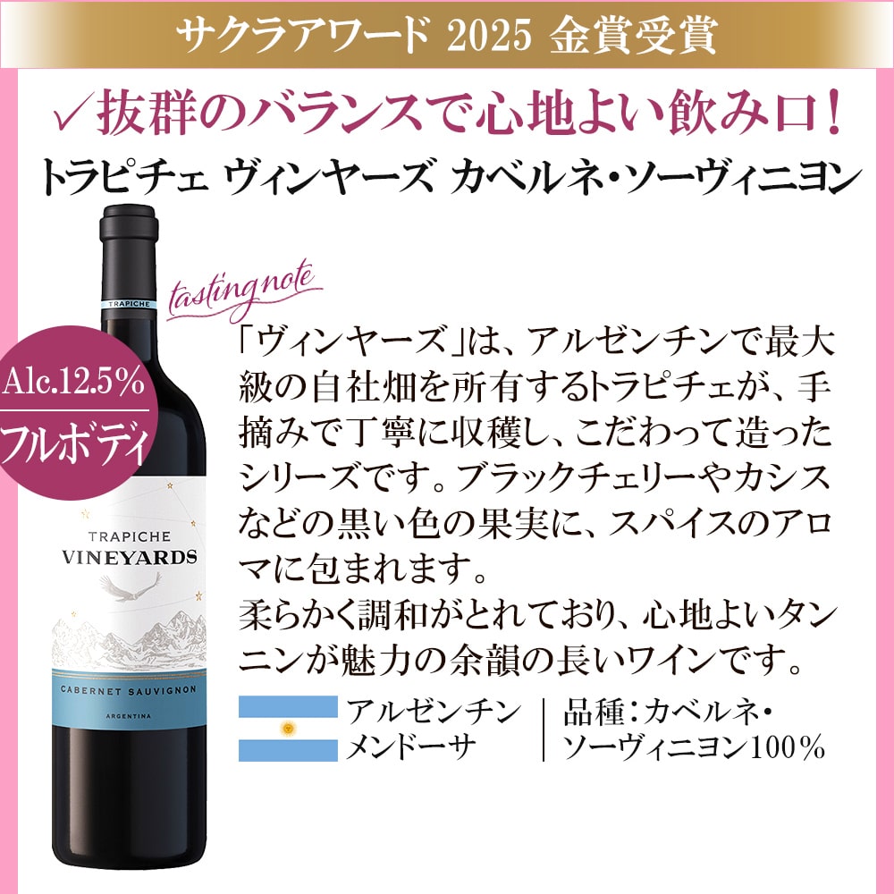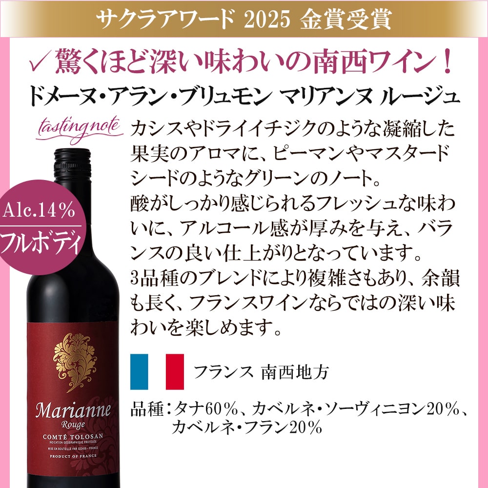 2014年、ワイン業界で活躍する女性のワインプロフェッショナルが審査を行う、日本最大級の国際ワインコンクールとして誕生した<SAKURAアワード>。 第12回目の開催となった2025年は、430名の審査員が世界36か国3962アイテムをブラインドテイスティングしました。 世界6カ国から厳選!すべてSAKURAアワード2025で、ゴールドを受賞した赤ワイン飲み比べ6本セットです。