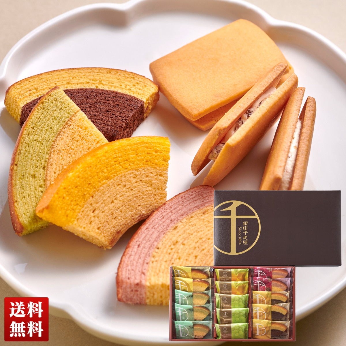 一層一層丁寧に焼き上げた生地と、果汁を加えて仕上げた生地の2つの味が絶妙なハーモニーの銀座フルーツクーヘン。なめらかで口当たりのやさしいフルーツクリームと香り豊かな果肉を香ばしいクッキーでサンドした銀座フルーツサンドの詰合せです。
