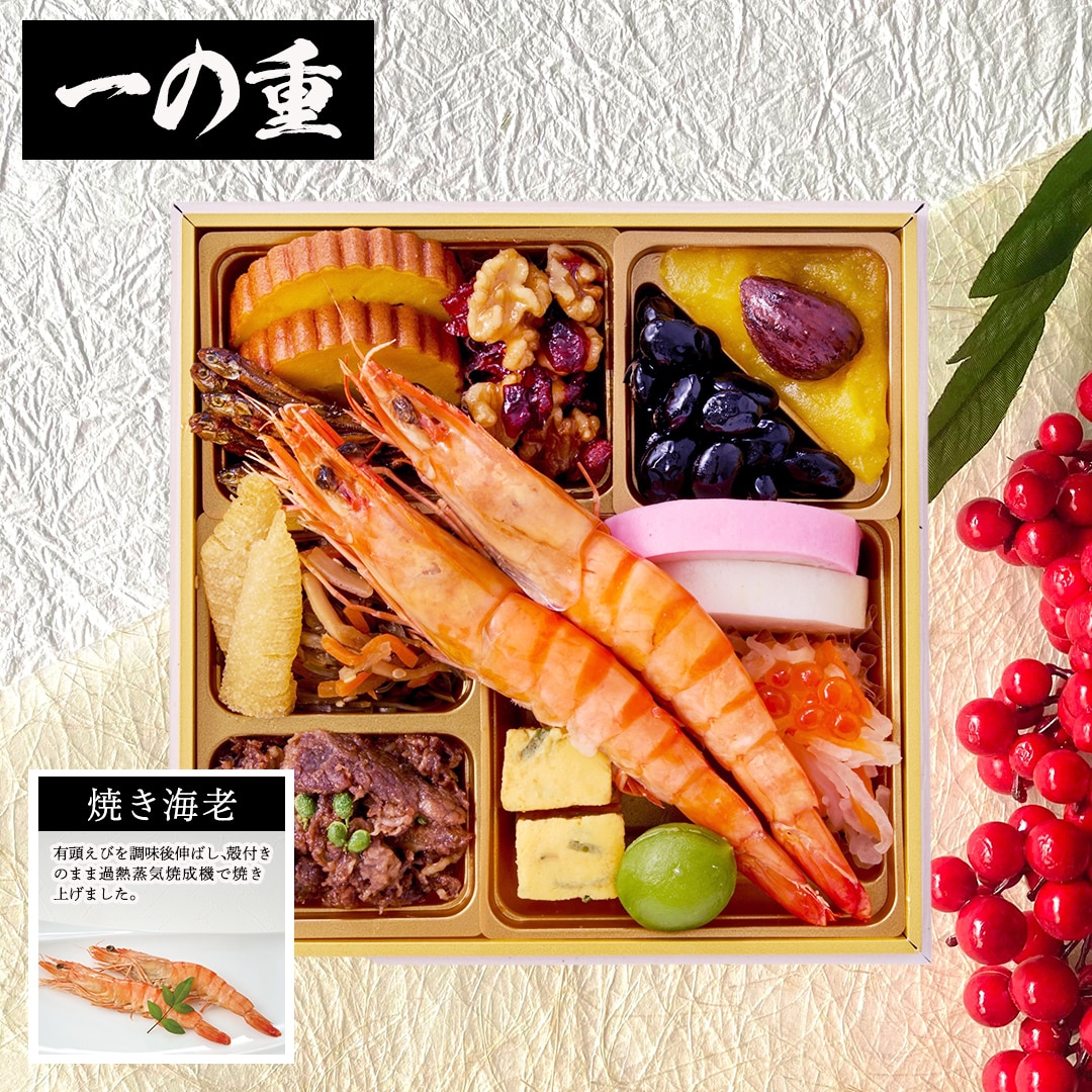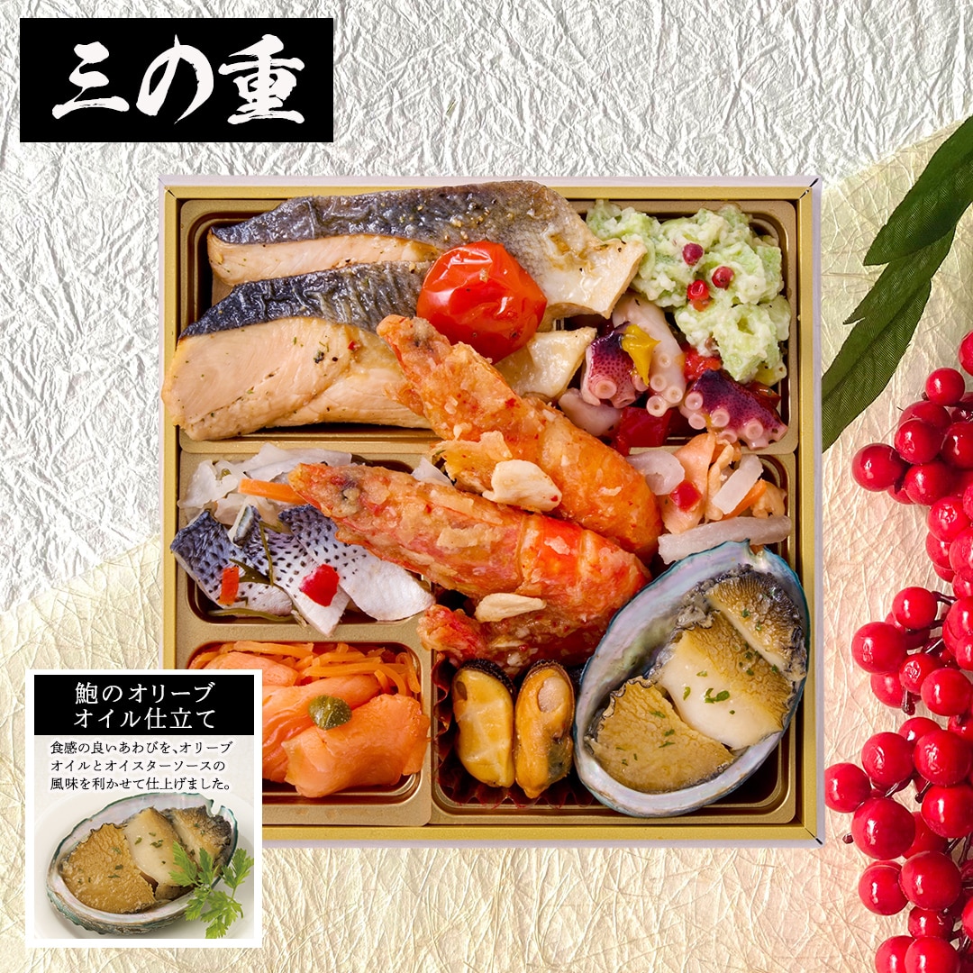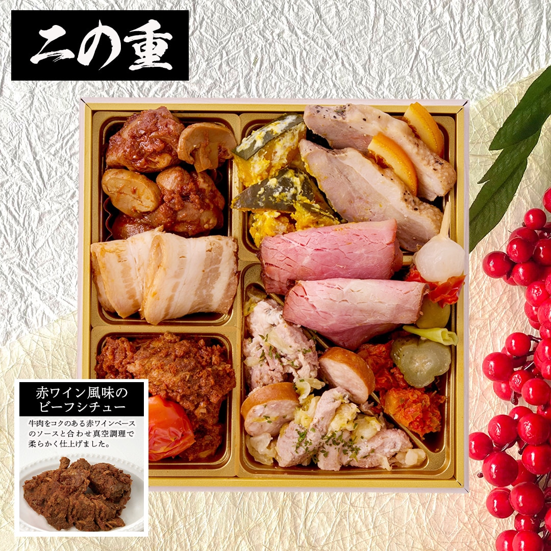 ■内容量:三段重、お重サイズ(外寸):縦165mm×横165mm×高さ183mm(内寸の高さ(1段)39mm)、(37品目)、(約2人前) 【一の重】伊達巻×2、クランベリーくるみ10g、田作り3g、鳴門金時芋きんとん25g、渋皮栗甘露煮、北海道産黒豆15g、北海道産昆布の松前漬15g、数の子×2、雪降り和牛尾花沢のしぐれ煮20g、青実山椒、かまぼこ(赤)、かまぼこ(白)、焼き海老×2、紅白なます20g、いくら醤油漬3g、九条葱の玉子焼×2、若桃甘露煮 【二の重】若鶏の赤ワイン煮込×2、豚ばらチャーシュー×2、北海道産栗南瓜のサラダ20g、合鴨ロースト×2、オレンジコンフィ×2、ローストビーフ×2、バンデリージャ(ピクルス)、セミドライトマトのマリネ8g、豚肉のアルザス風煮込50g、赤ワイン風味のビーフシチュー50g、セミドライチェリートマト 【三の重】カラフトマスのレモンペッパー焼×2、セミドライチェリートマト、魚卵ずんだのマヨネーズ風味15g、たこのバジルソース15g、小肌かぶら漬20g、国産キャロットオニオンサラダ15g、スモークサーモン×3、ケーパー×2、ガーリックシュリンプ×2、華やか野菜マリネ15g、ムール貝スモーク×2、鮑のオリーブオイル仕立て