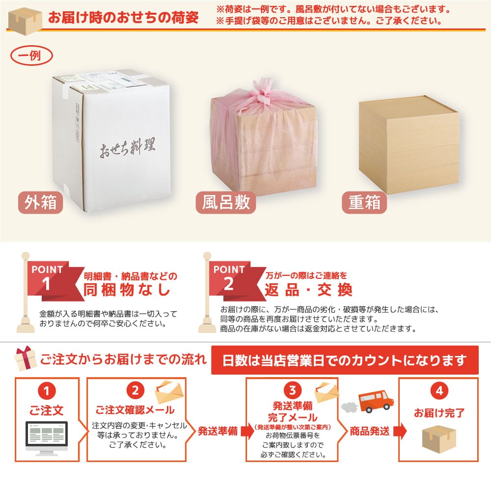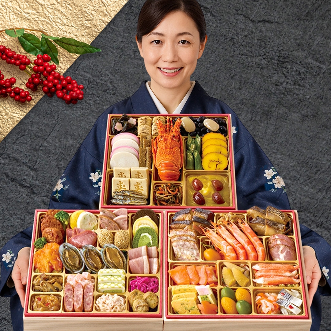 ■内容量:三段重お重サイズ(外寸):縦258mm×横258mm×高さ177mm(内寸(1段):39mm)(62品目)(約3~4人前) 【一の重】昆布旨煮×3、梅型百合根羊羹×2、焼き湯葉巻×4、黒豆煮60g、白花豆煮×2、紅蒲鉾×2、白蒲鉾×2、たたきごぼう×7、ロブスター、オクラの浅漬×5、伊達巻×4、寿高野豆腐×4、田作り煮10g、きんとん100g、渋皮栗甘露煮×4、松前漬40g 【二の重】ぶり照焼×4、はすの芽(梅酢風味)3g、くるみ甘露煮30g、わかめ煮30g、真鯛幽庵焼×4、ミートローフ×3、葉付金柑甘露煮、有頭海老×4、ローストポーク×3、キャロットラペ30g、スモークサーモントラウト×4、ソデイカ昆布和え30g、数の子×3、大根焙煎胡麻サラダ30g、蟹風味蒲鉾土佐酢漬×3、九条葱入り玉子焼×3、博多高野(海老)、博多高野(ほうれん草)、梅型蒟蒻、若桃甘露煮×2、杏子煮×2、紅白なます30g、こはだレモン30g 【三の重】ハンバーグ×3、ブロッコリー(コンソメ風味)×2、豆乳と野菜の新丈(かぼちゃ)、豆乳と野菜の新丈、豚タン15g、ボロニアソーセージ×2、牛タン入ソーセージ×2、胡麻団子×2、ロールケーキ(チョコバナナ)、ロールケーキ(チーズ&レモン)、ロールケーキ(宇治抹茶)、ザーサイ15g、海老チリソース×2、小松菜と揚げの煮物25g、鮑旨煮×3、合鴨スモーク×4、つぶ貝時雨煮20g、中華くらげ30g、梅肉マヨサラダ25g、サラミ風ソーセージ×3、ハムとチーズソースのテリーヌ×3、海鮮サラダ25g、レッドキャベツのラペ25g、帆立香草焼×3