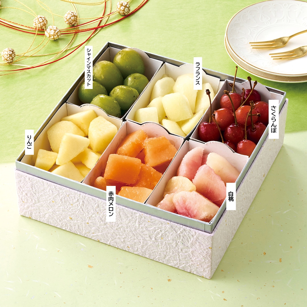 ■内容量:一段重、お重サイズ(外寸):縦183mm×横183mm×高さ67mm(内寸(1段):48mm)、(6品目) シャインマスカット・ラフランス・さくらんぼ・りんご・赤肉メロン・白桃各100g