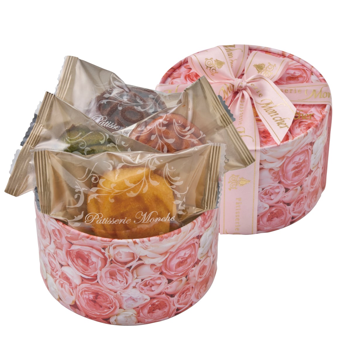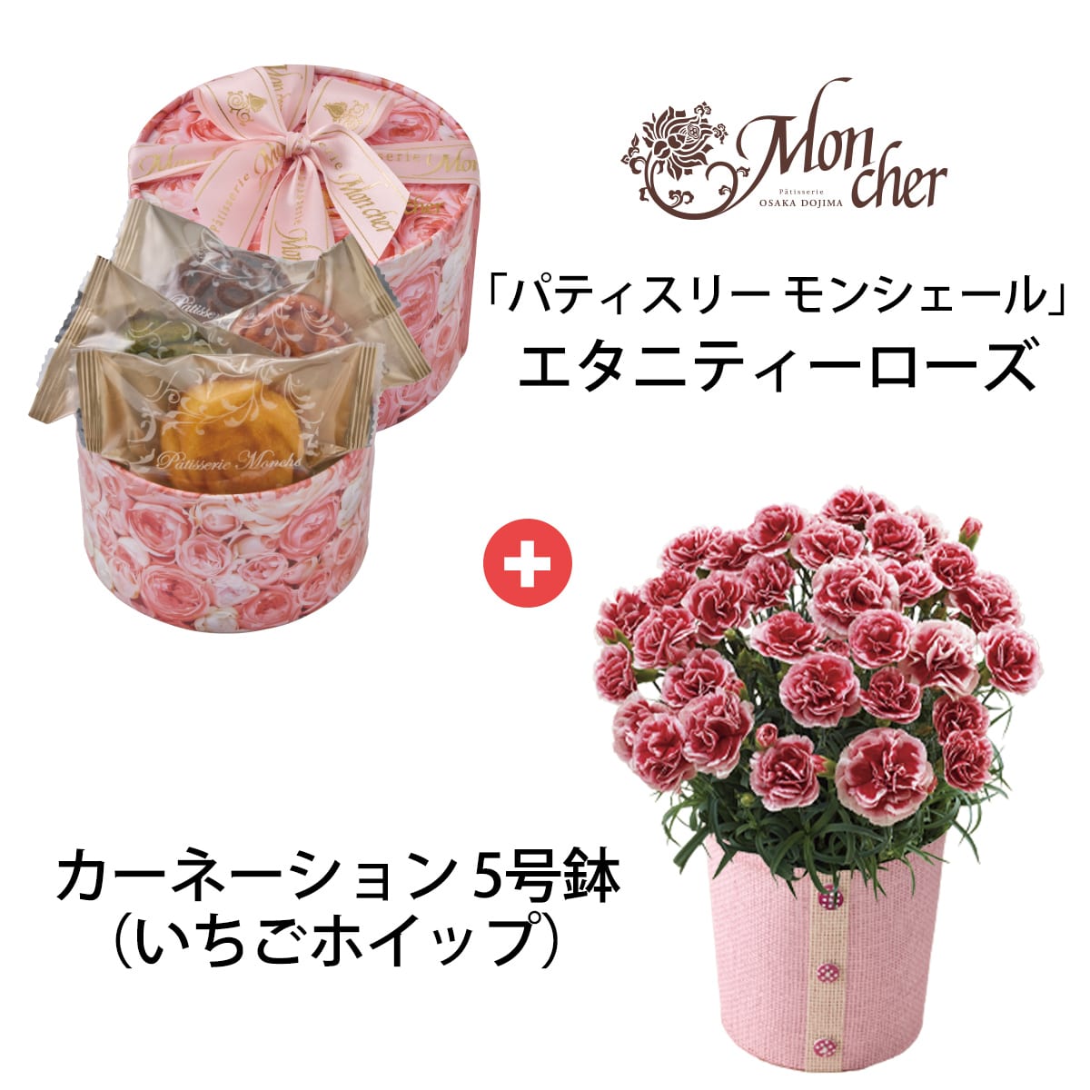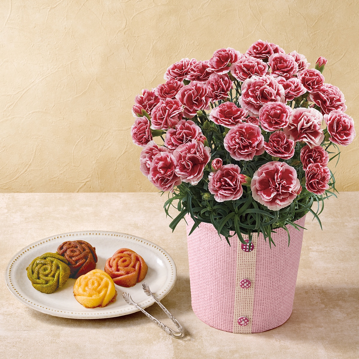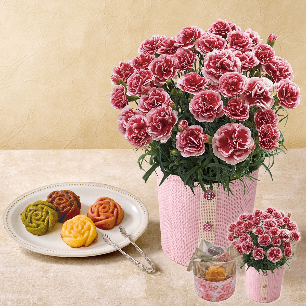 さまざまなピンク色が楽しめる八重咲きのカーネーションと「パティスリーキハチ」の焼菓子をセットでお届け。