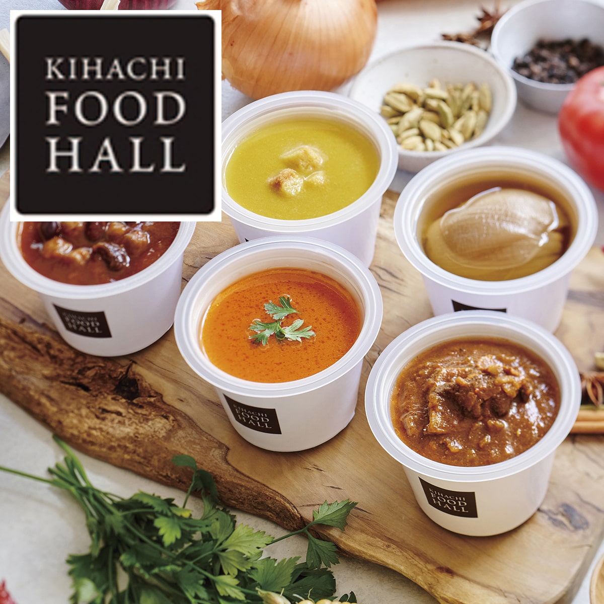 東京青山のレストラン「KIHACHI」のシェフが監修した5種類の美味しいスープとカレーをカップに閉じ込めました。常温で保存でき、食べる時にレンジで1分、温めるだけ。シェフのこだわりの味が自分の好きな場所、好きなシーンで手軽にお楽しみいただけます。
