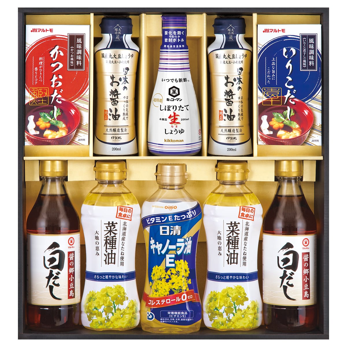 ■内容量:キッコーマンいつでも新鮮しぼりたて生しょうゆ200ml、国産菜種油350g×2、伊賀越日本のお醤油200ml×2、マルキン白だし360ml×2、マルトモ(かつおだし・いりこだし)各8g×各5P、日清キャノーラ油E350g