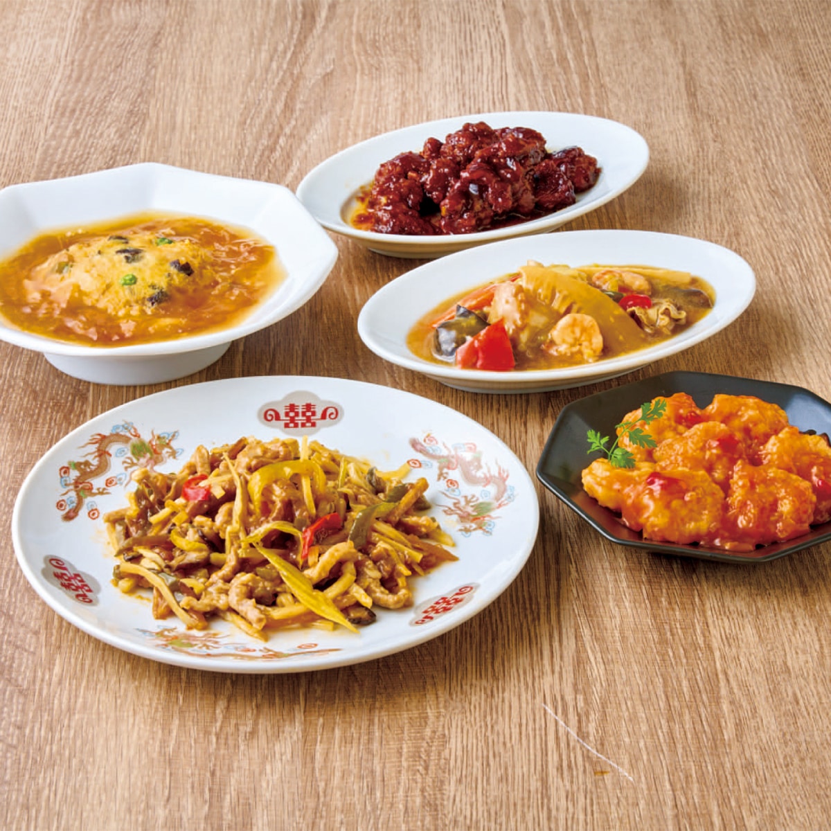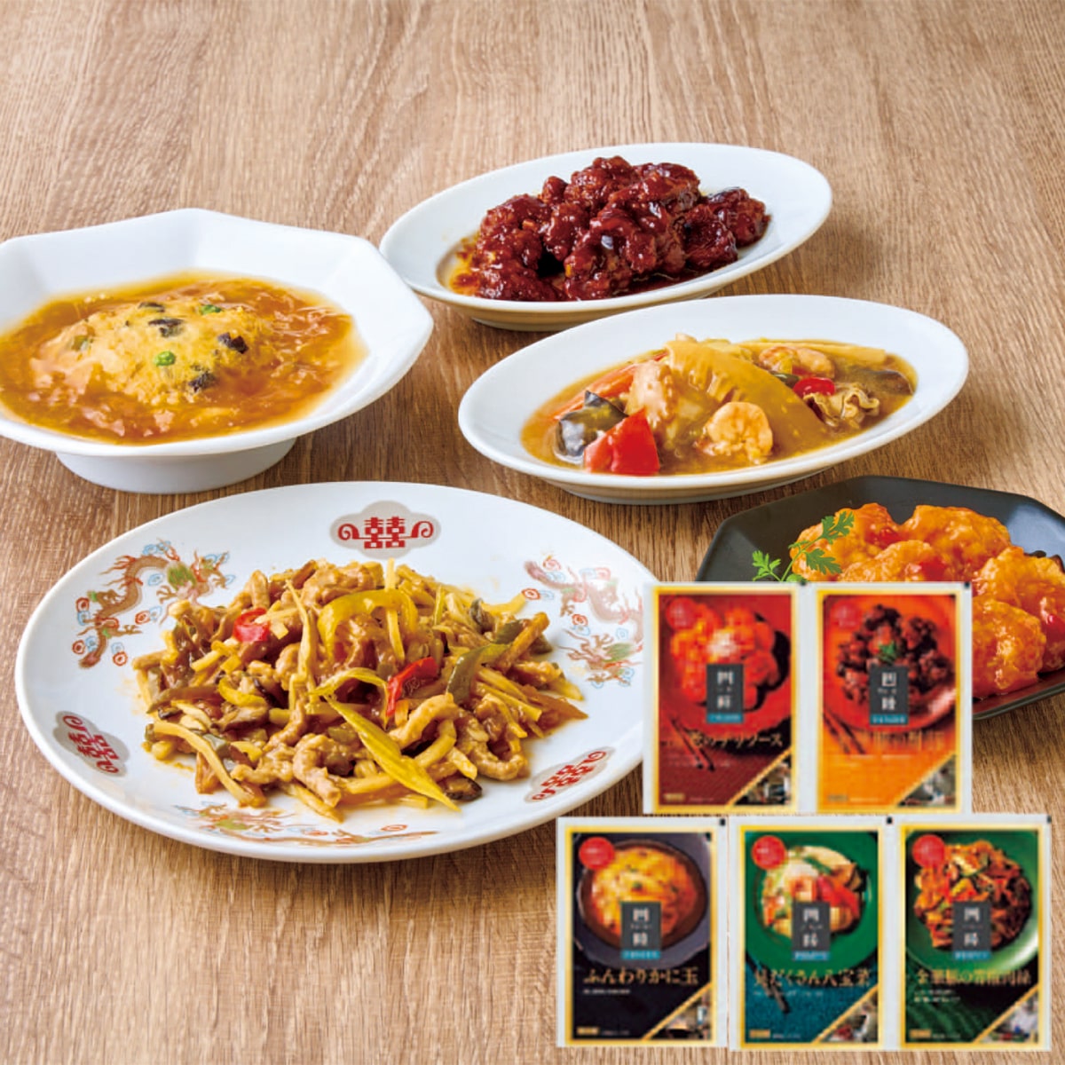 ■内容量:金華豚の青椒肉絲・金華豚の酢豚・海老のチリソース各150g、ふんわりかに玉185g、具だくさん八宝菜170g