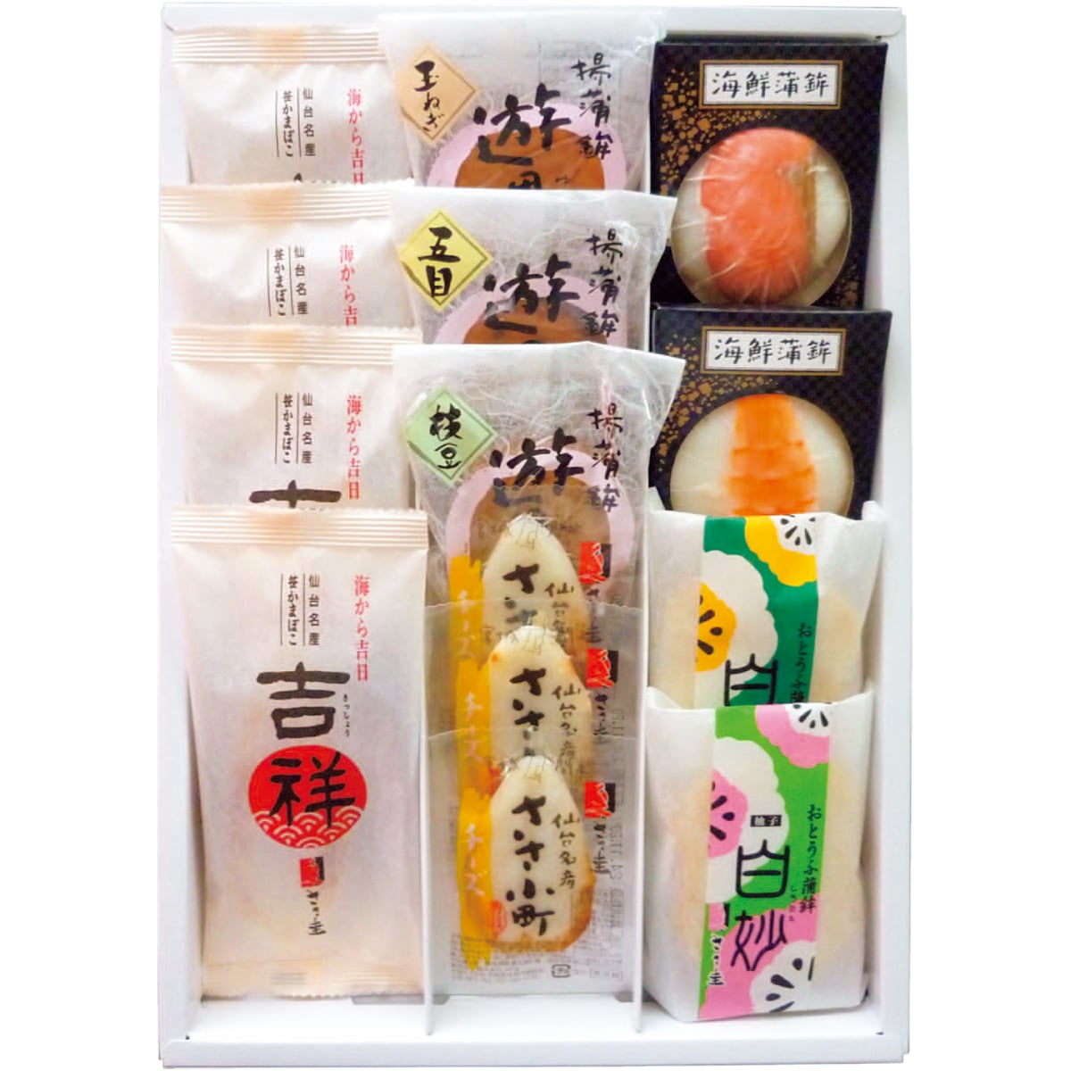 ■内容量:笹かまぼこ35g×4、真空笹かまぼこ(チーズ)20g×3、揚げ蒲鉾(枝豆・五目・玉ねぎ)各40g、おとうふ蒲鉾(柚子・プレーン)各50g、海鮮蒲鉾(えび・紅鮭)各50g