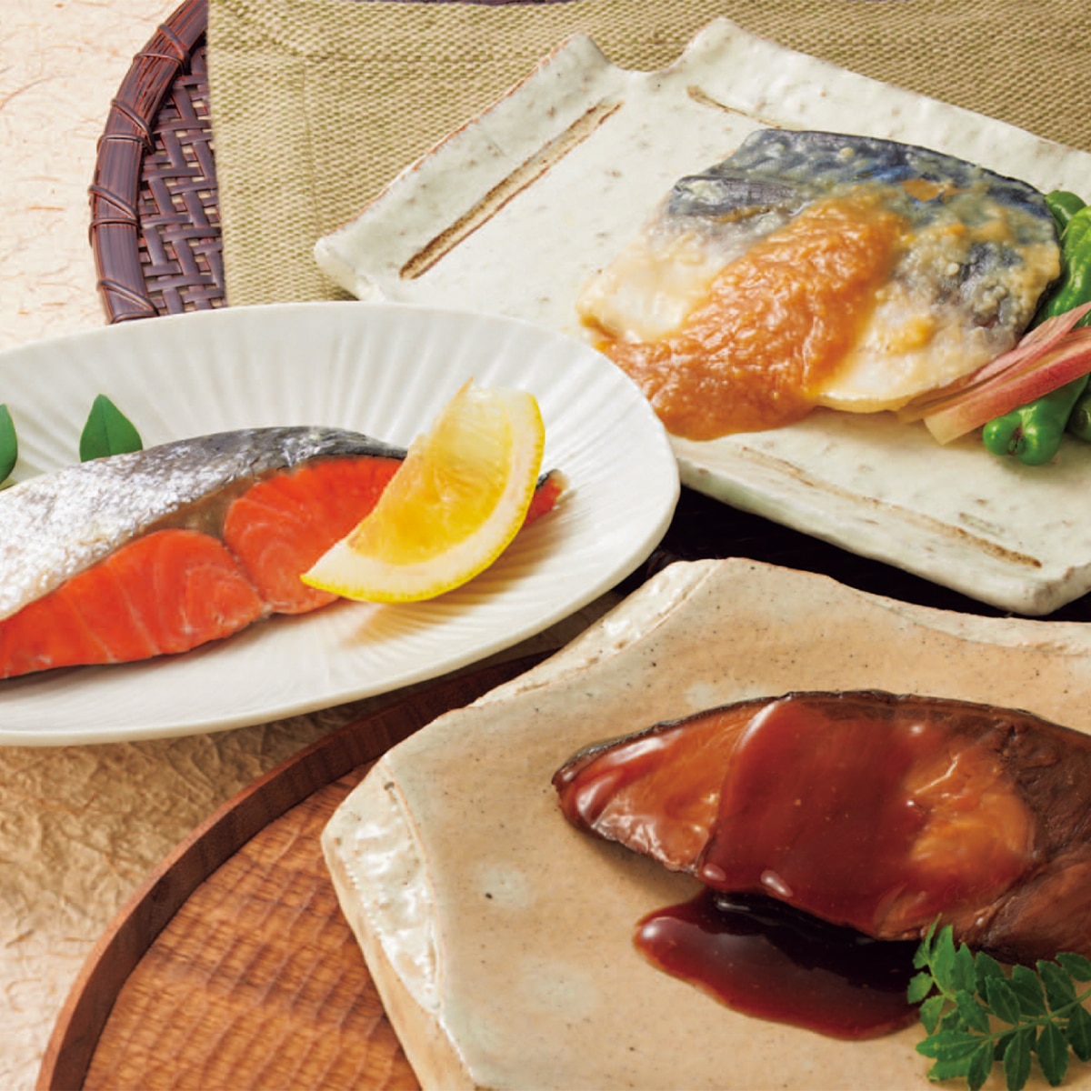 ■内容量:紅鮭の塩焼き60g・めぬけと黄金生姜の煮付け100g・ぶりの照り焼き90g・さばの味噌煮90g・のどぐろの煮付け85g×各2