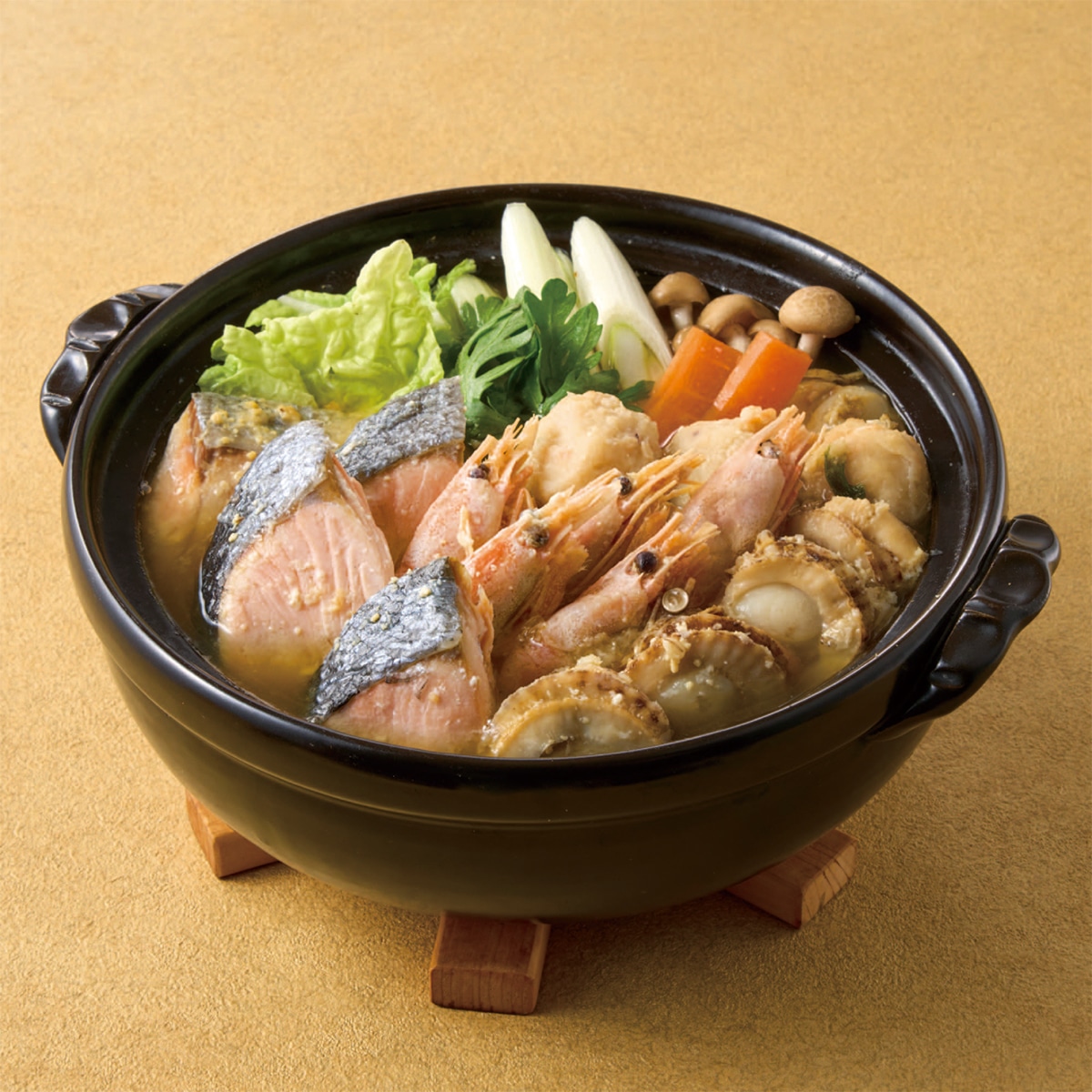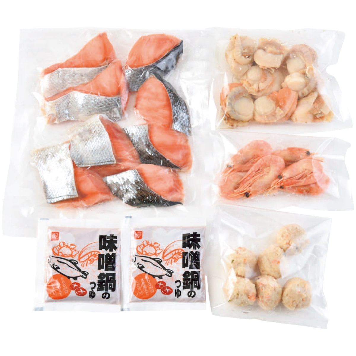 ■内容量:約3人前/鮭切身320g、えび・帆立・えびつみれ×各6、味噌鍋のつゆ50g×2