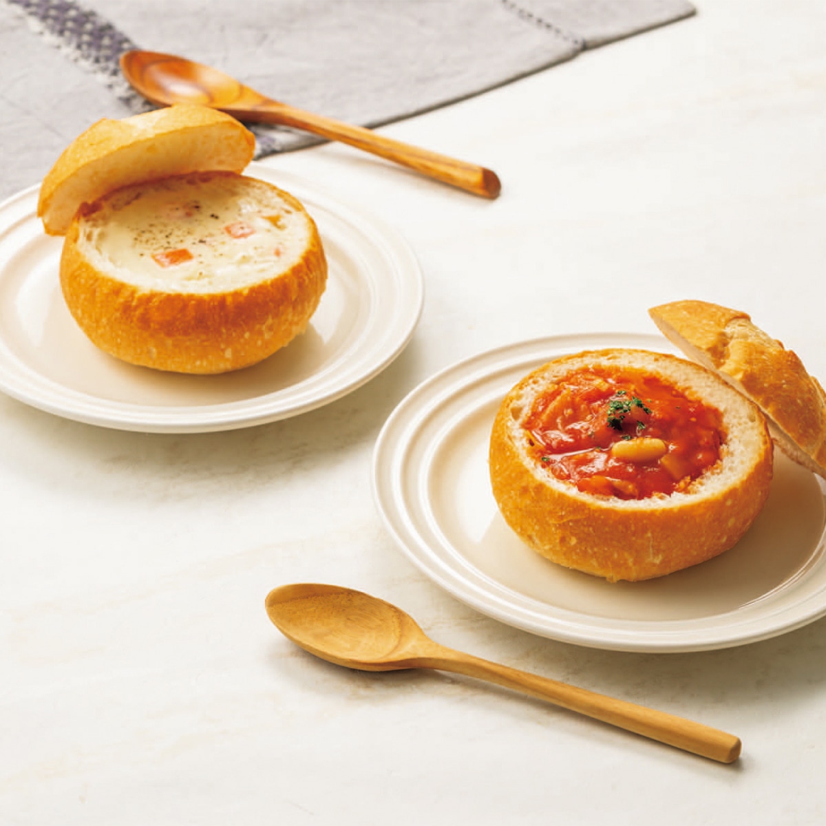 芳醇な小麦が香るセミハード生地のブレッドボウルに、素材の旨味が溶け込んだ濃厚スープをたっぷりと注ぎ込みました。口に入れた瞬間に広がる小麦の香りと、とろけるようなスープのハーモニーはまさに至福の味わいです。スープは、トマトベースのミネストローネとコク深いクリームスープの2種類からお選びいただけます。食卓に彩りを添え、最後の一滴まで飲み干したくなる贅沢な逸品をぜひご賞味ください。