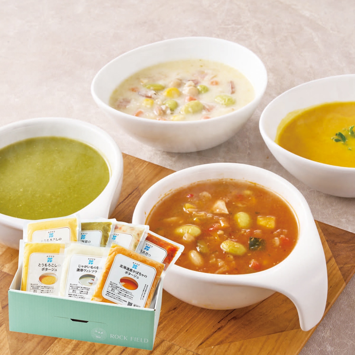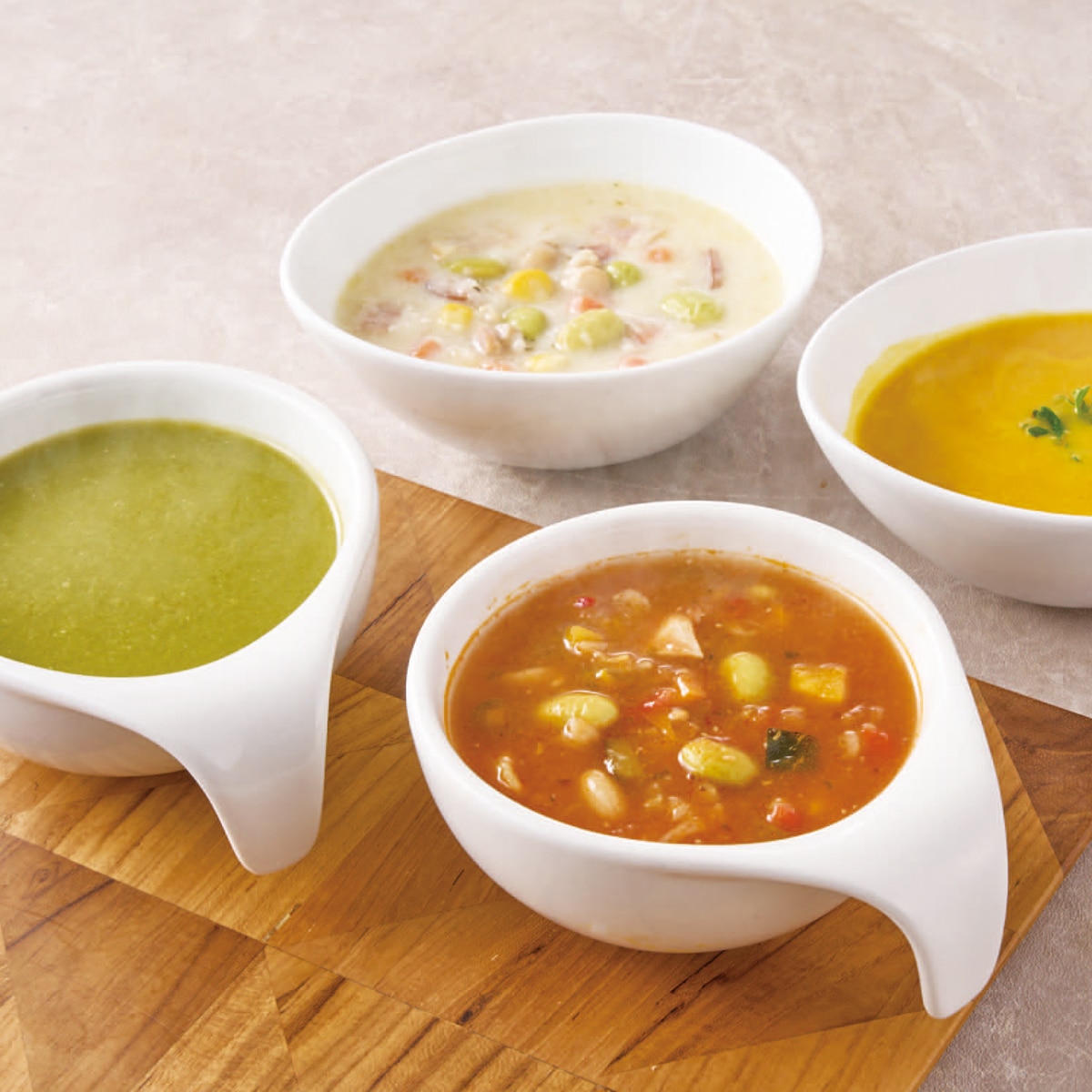 ■内容量:ポタージュ(とうもろこし×2・10種野菜・じゃがいもの旨み濃厚ヴィシソワーズ・北海道産かぼちゃ)各180g、具沢山スープ(クリームチャウダー・15品目のミネストローネ)各230g
