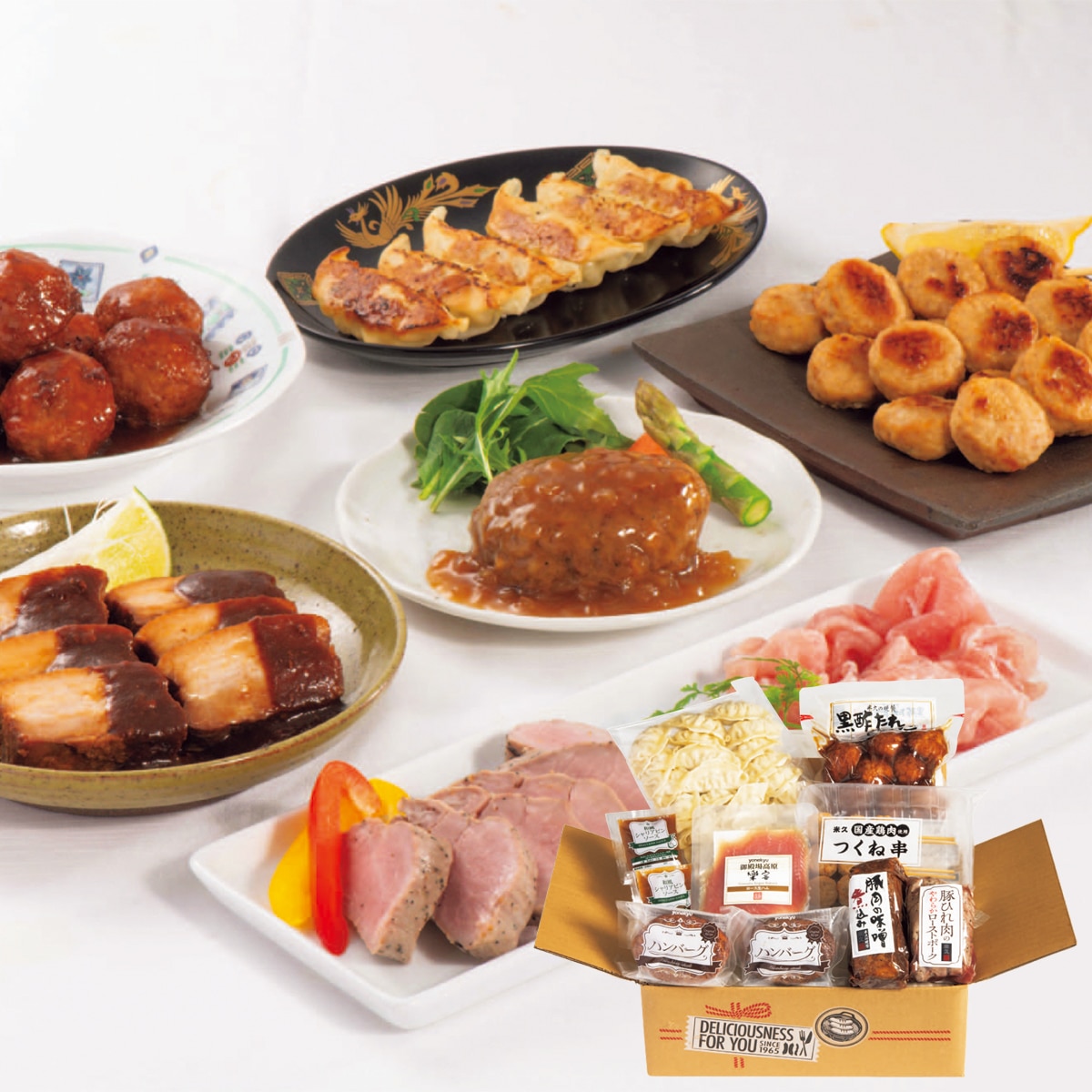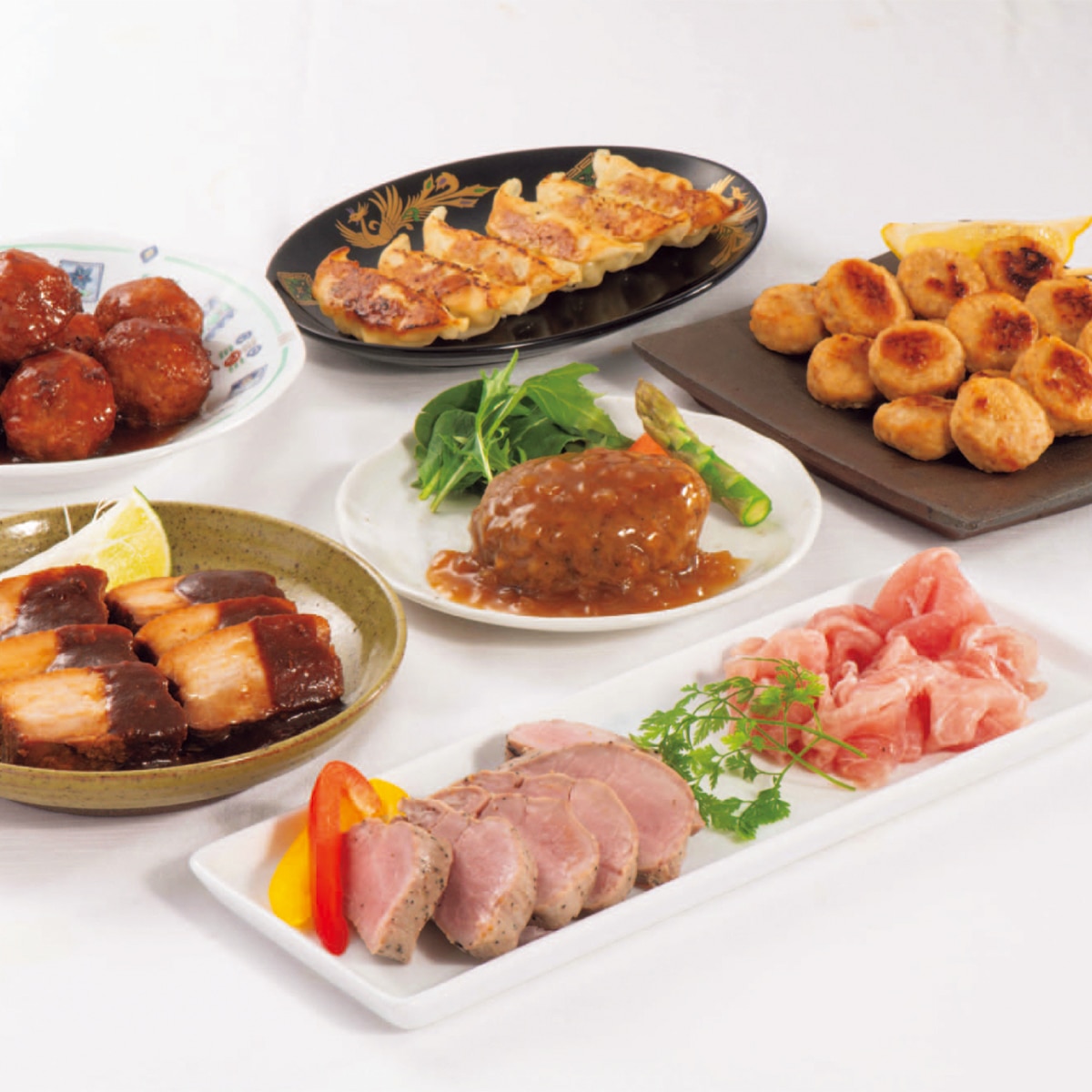 ■内容量:国産野菜とお肉の餃子360g、豚ひれ肉のローストポーク100g、黒酢たれ肉だんご300g、つくね串210g、豚肉の味噌煮込み210g、ロース生ハムスライス67g、ハンバーグ130g・和風シャリアピンソース40g×各2