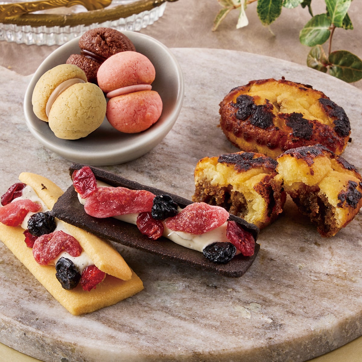 カカオ香るサクサク食感のサブレに、3種のベリー(ストロベリー、クランベリー、ブルーベリー)をバニラビーンズとホワイトチョコを使用したクリームにトッピングした今だけ限定のカカオベリーウィッチ。華やかな見た目と味わいの2種のドレスアップクッキーをお愉しみいただけます。今だけ限定の美味しさがたくさん入った1箱です。