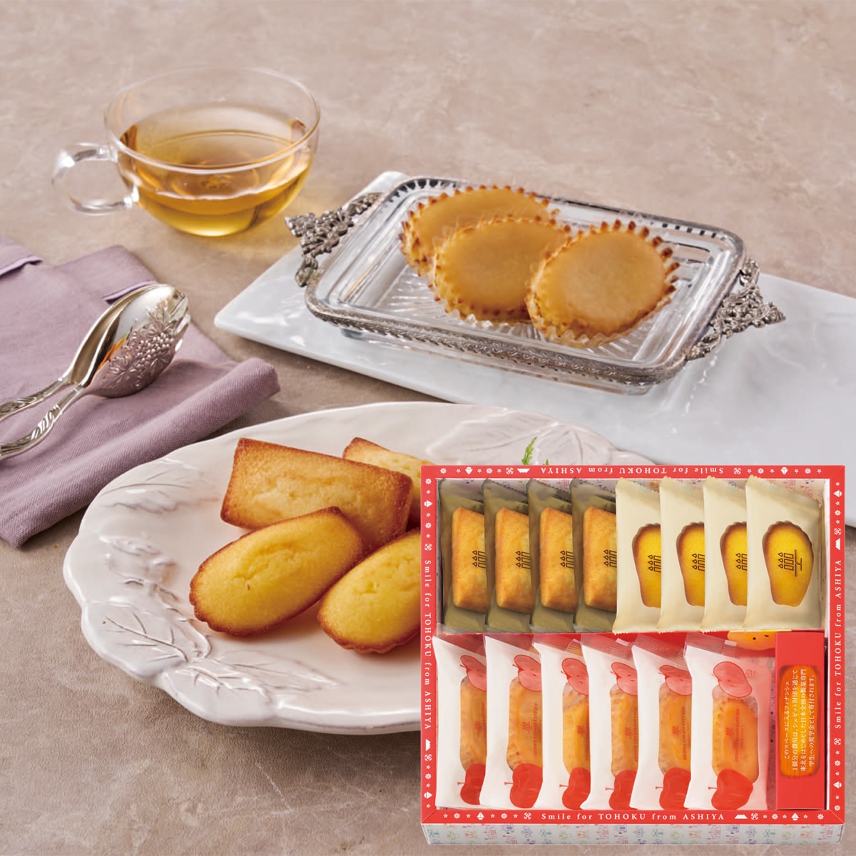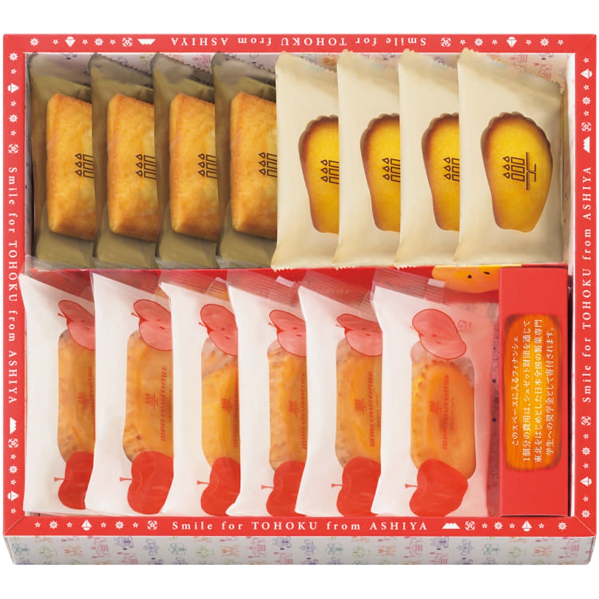 まろやかでコクのある蔵王のクリームチーズと、青森県産※のみずみずしく爽やかな甘みの林檎でく作ったジャムを使用し、しっとりとりと焼き上げたケーク・フロマージュ。アンリ・シャルパンティエ定番のフィナンシェとマドレーヌに東北産の美味しさを使ったお菓子の詰め合わせです。あえてフィナンシェを1つ減らした商品を正かでご購入いただき、フィナンシェ1個分の金額をお客様からの寄付に、そして募金と同額をアンリ・シャルパンティエからも寄付しています。※使用しているりんご総量のうち、青森県産りんごを44%使用しています