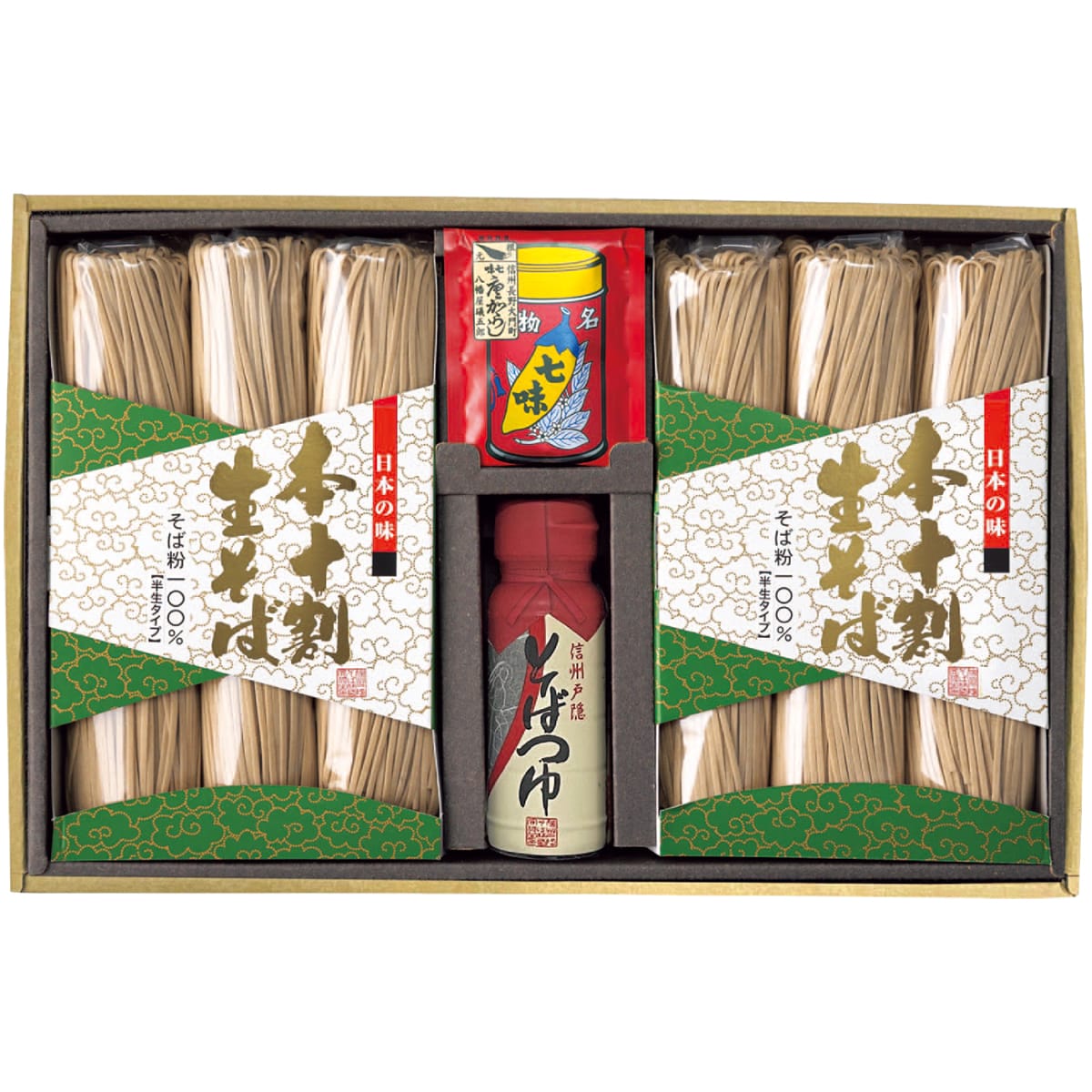 そば粉100%の半生タイプの十割そば。当社独特の非熱処理製法によりそばの旨味を逃すことなく、打ちたて生そばの風味を生かした本格派。十割そばならではの、深い味わいと挽きたてのそば粉の香り、風味豊かなしっかりとした喉越しがそばそのものの旨みを存分に伝えてくれます。香り、粘度、旨さを兼ね備えた濃厚なそば湯も飲めますので、そばを丸ごとお楽しみいただけるこだわりのそばです。そばと相性のよいだしが効いたまろやかな味わいの濃縮つゆと信州名物、日本三大七味である、国宝 善光寺詣りの手形とも謂われる八幡屋礒五郎の七味唐辛子もセット。■商品特徴:そば粉100%の半生タイプの十割そば。当社独特の非熱処理製法によりそばの旨味を逃すことなく、打ちたて生そばの風味を生かした本格派。十割そばならではの、深い味わいと挽きたてのそば粉の香り、風味豊かなしっかりとした喉越しがそばそのものの旨みを存分に伝えてくれます。香り、粘度、旨さを兼ね備えた濃厚なそば湯も飲めますので、そばを丸ごとお楽しみいただけるこだわりのそばです。そばと相性のよいだしが効いたまろやかな味わいの濃縮つゆと信州名物、日本三大七味である、国宝 善光寺詣りの手形とも謂われる八幡屋礒五郎の七味唐辛子もセット。