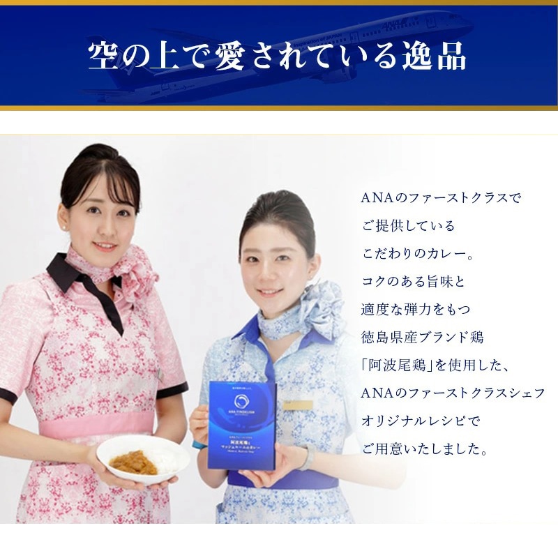 ANAのファーストクラスでご提供しているこだわりのカレー 贈り物に最適な厚手で美しいギフトボックス入りでお届けします。 ■内容量 阿波尾鶏とマッシュルームのカレー:6食(1食あたり180g)
