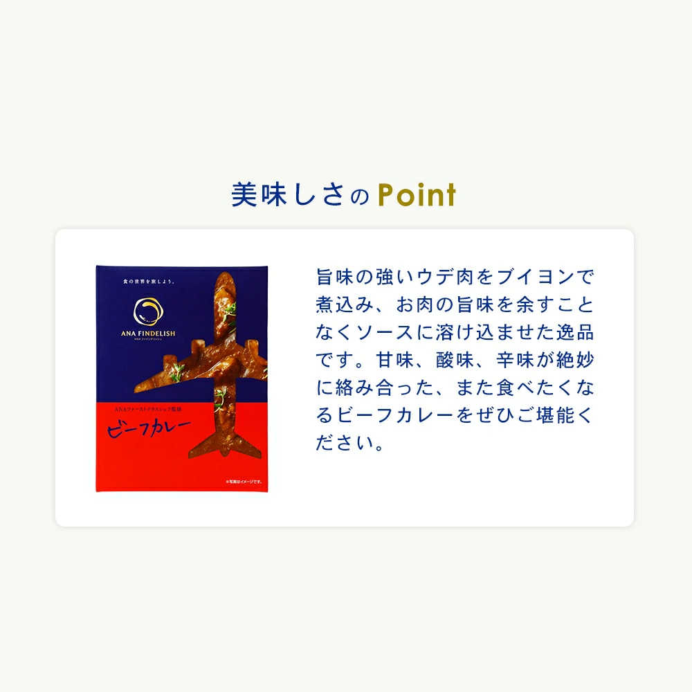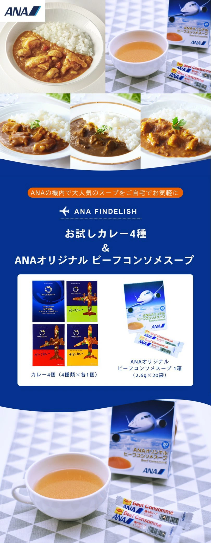 【ANA FINDELISH】 お試しカレー4種+ANAオリジナルビーフコンソメスープセット (カレー4種×1個ずつ、ビーフコンソメスープ1箱) 皆様からのお声にお応えして待望のANAオリジナルビーフコンソメスープの お取り扱いを開始いたしました! ANAならではのセットをお楽しみください。 ■内容量 ・阿波尾鶏とマッシュルームのカレー 1個 ・ANA FINDELISH ビーフカレー 1個 ・ANA FINDELISH チキンカレー 1個 ・ANA FINDELISH ポークカレー 1個 ・ANAオリジナルビーフコンソメスープ 1箱(2.6g×20袋)